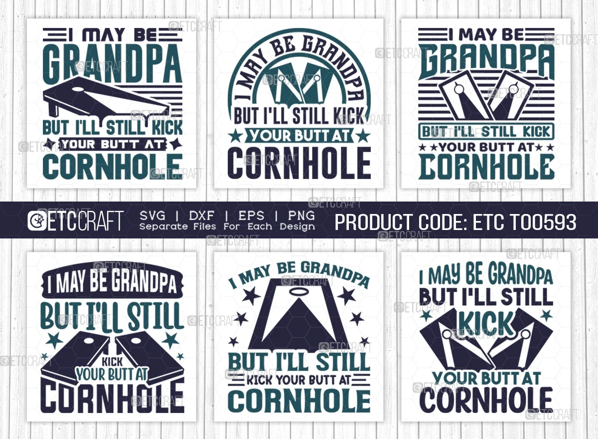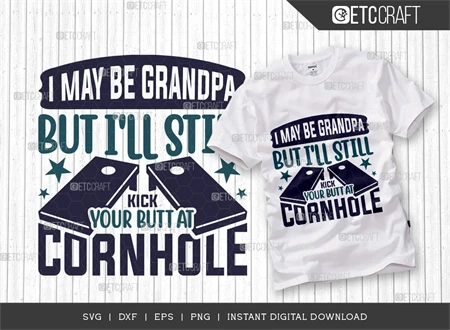 F.A.Q.s: Q: What's included in the SVG bundle? A: The bundle includes high-quality SVG files of the "I May Be Grandpa, But I'll Still Kick Your Butt At Cornhole" design in various formats.