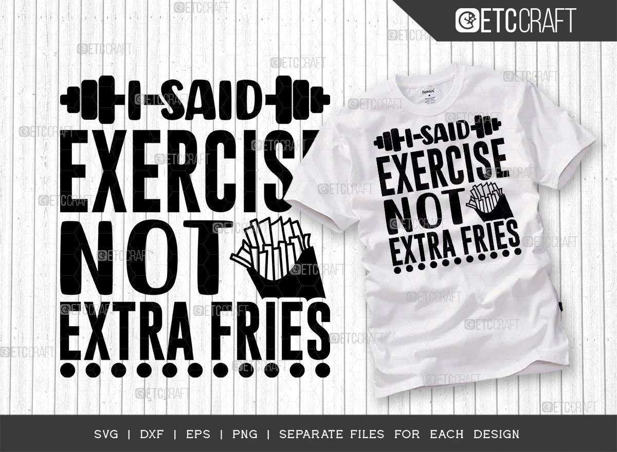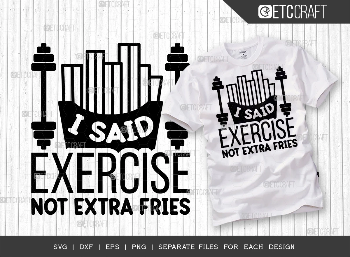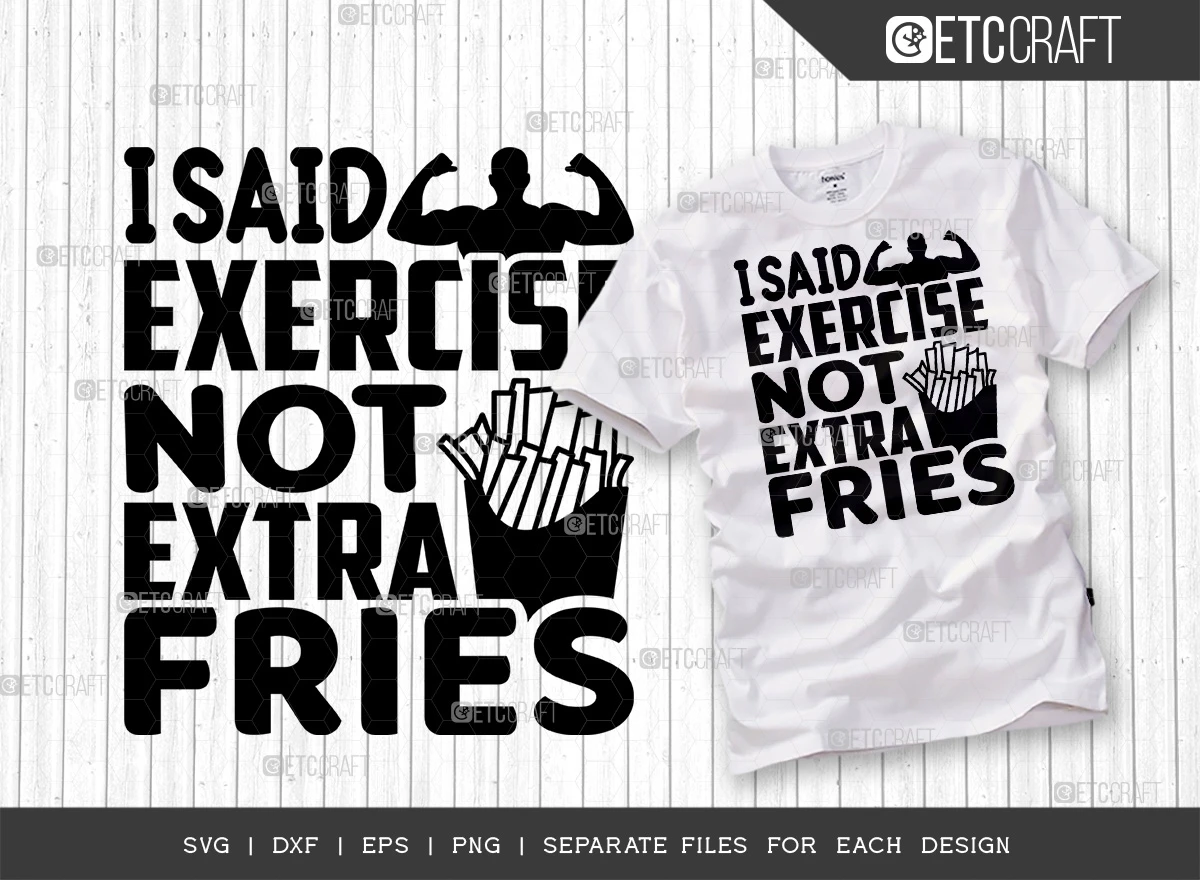 Introducing the "I Said Exercise Not Extra Fries SVG Bundle" - the perfect t-shirt design for fitness enthusiasts, gym-goers, and those committed to a healthy lifestyle. This bundle features a collection of high-quality SVG files, including weights, gym, fitness, workout, bodybuilding, and gym quotes designs.