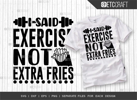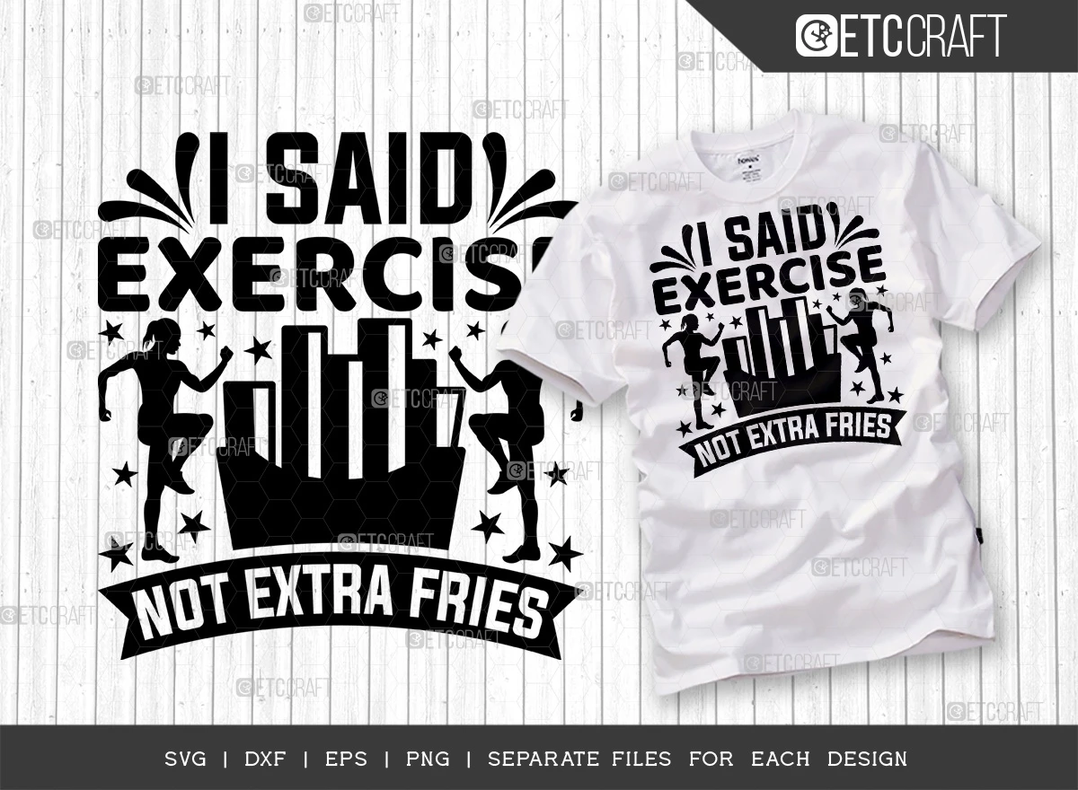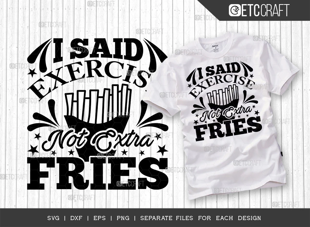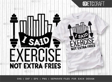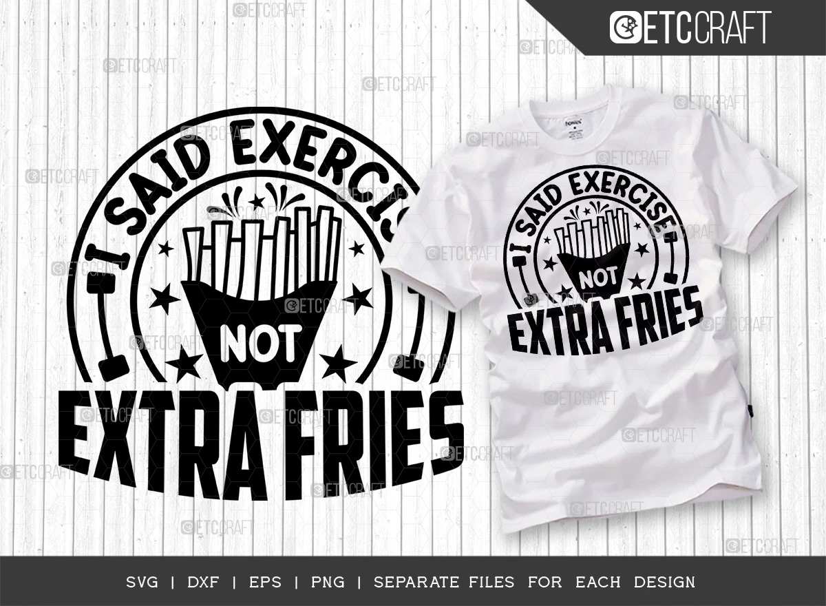Introducing the "I Said Exercise Not Extra Fries SVG Bundle" - the perfect t-shirt design for fitness enthusiasts, gym-goers, and those committed to a healthy lifestyle. This bundle features a collection of high-quality SVG files, including weights, gym, fitness, workout, bodybuilding, and gym quotes designs.
