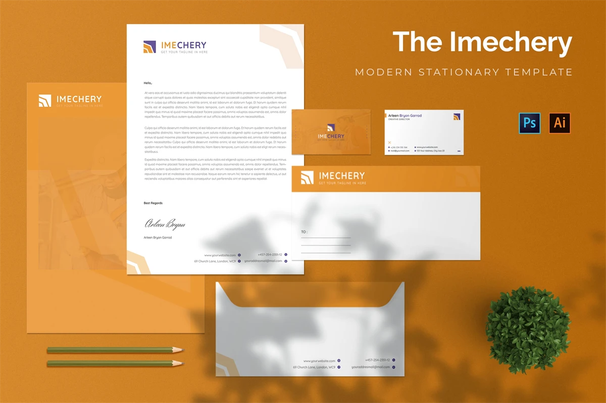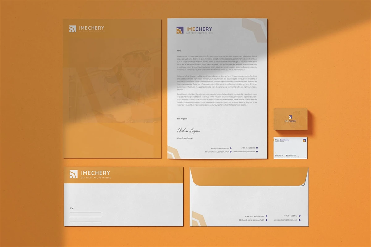 Imechery - Stationary. This template is great for your business and this design will make your interested, elegant, and easily editable according to your needs. I hope you enjoy for this stationary.
