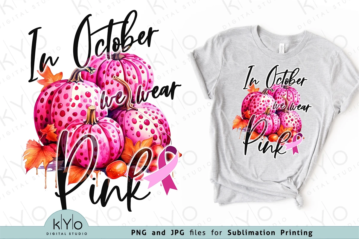 In October We Wear Pink Sublimation Design in PNG and JPG Image format, Breast Cancer Support Shirt design, Pink Ribbon, Pink October, Pink Pumpkin.
