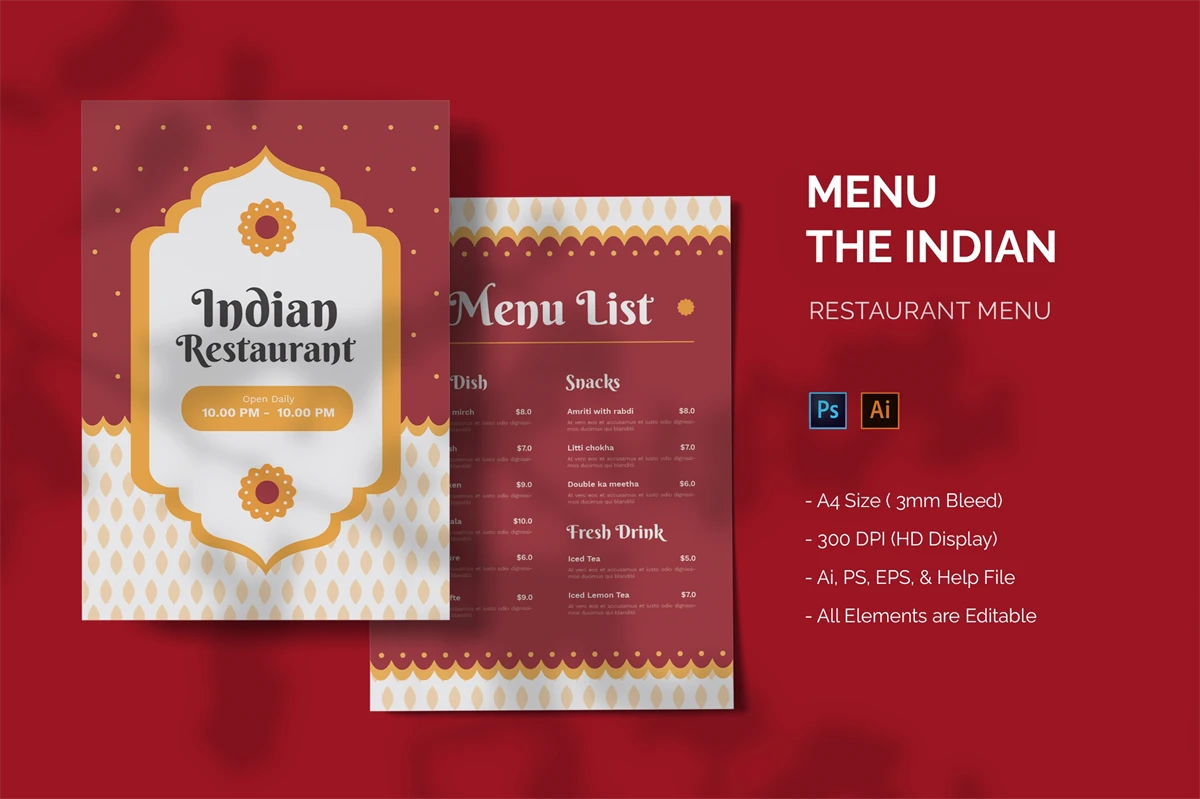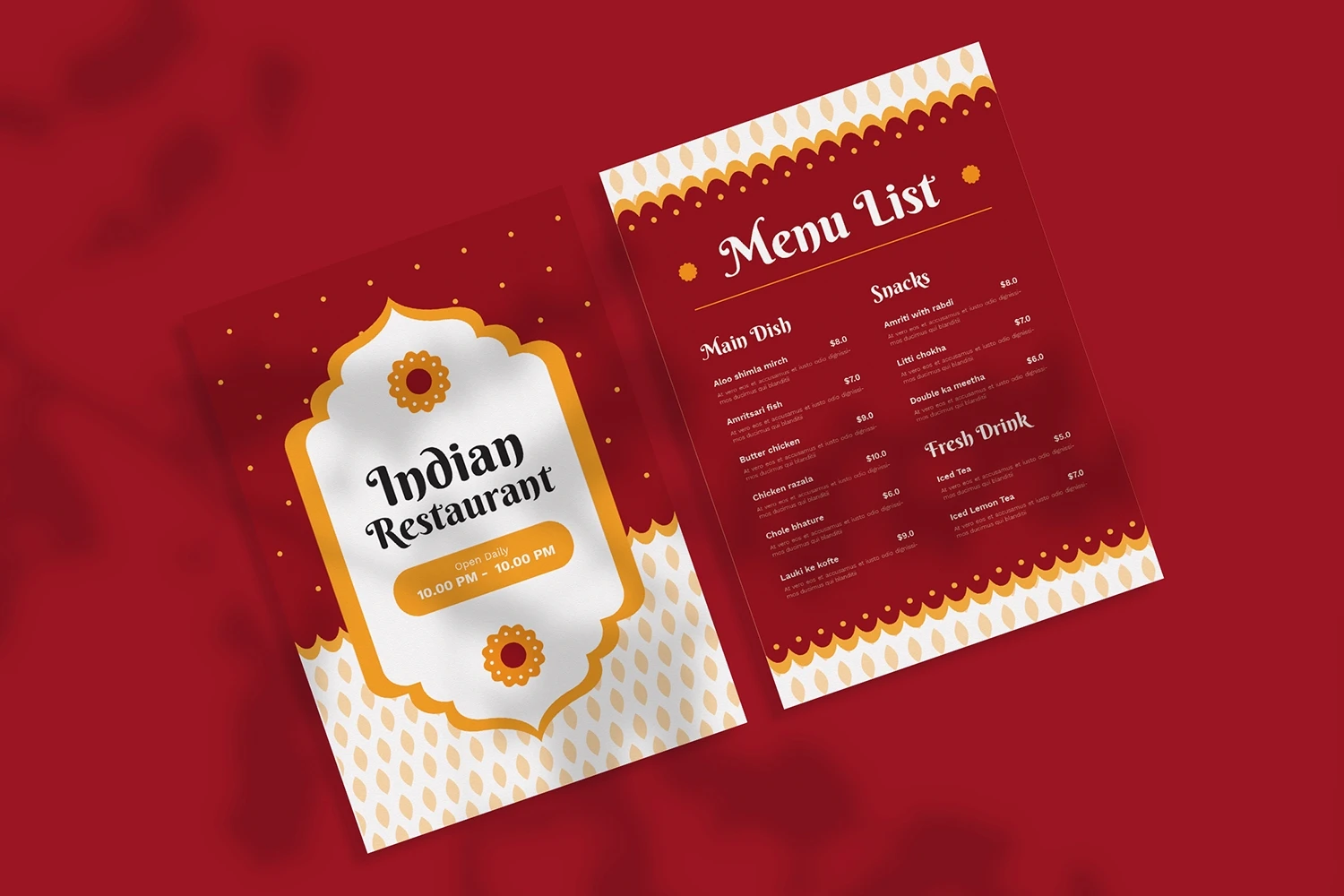 Indian - Restaurant Menu. This template is great for your business and will make your customers interested, elegant, and easily editable according to your needs, this restaurant menu is perfect for, promos, cafes, hotels, resort shops online. etc. I hope you enjoy this restaurant menu