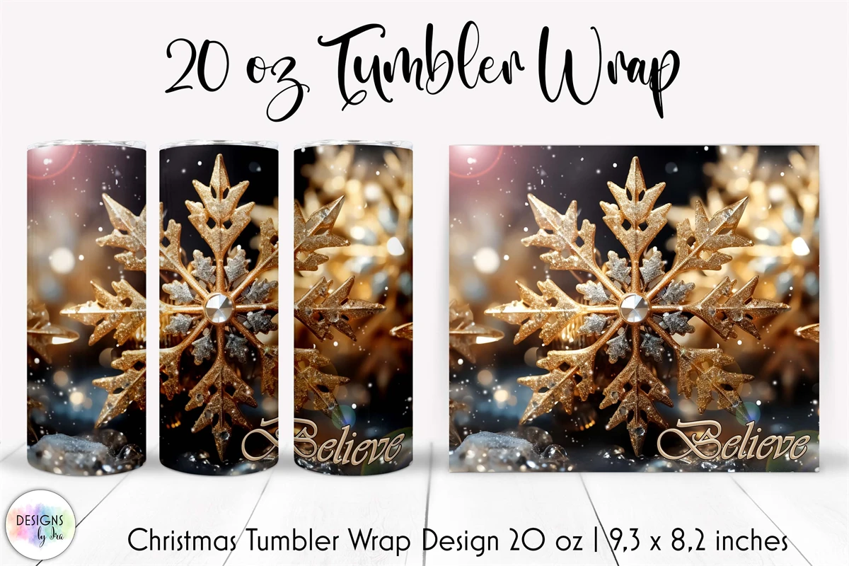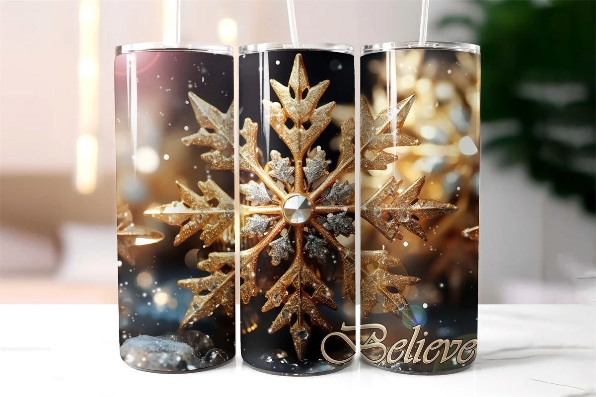 Beautiful Christmas tumbler wrap designs with shimmering snowflakes, stardust inspirational saying.