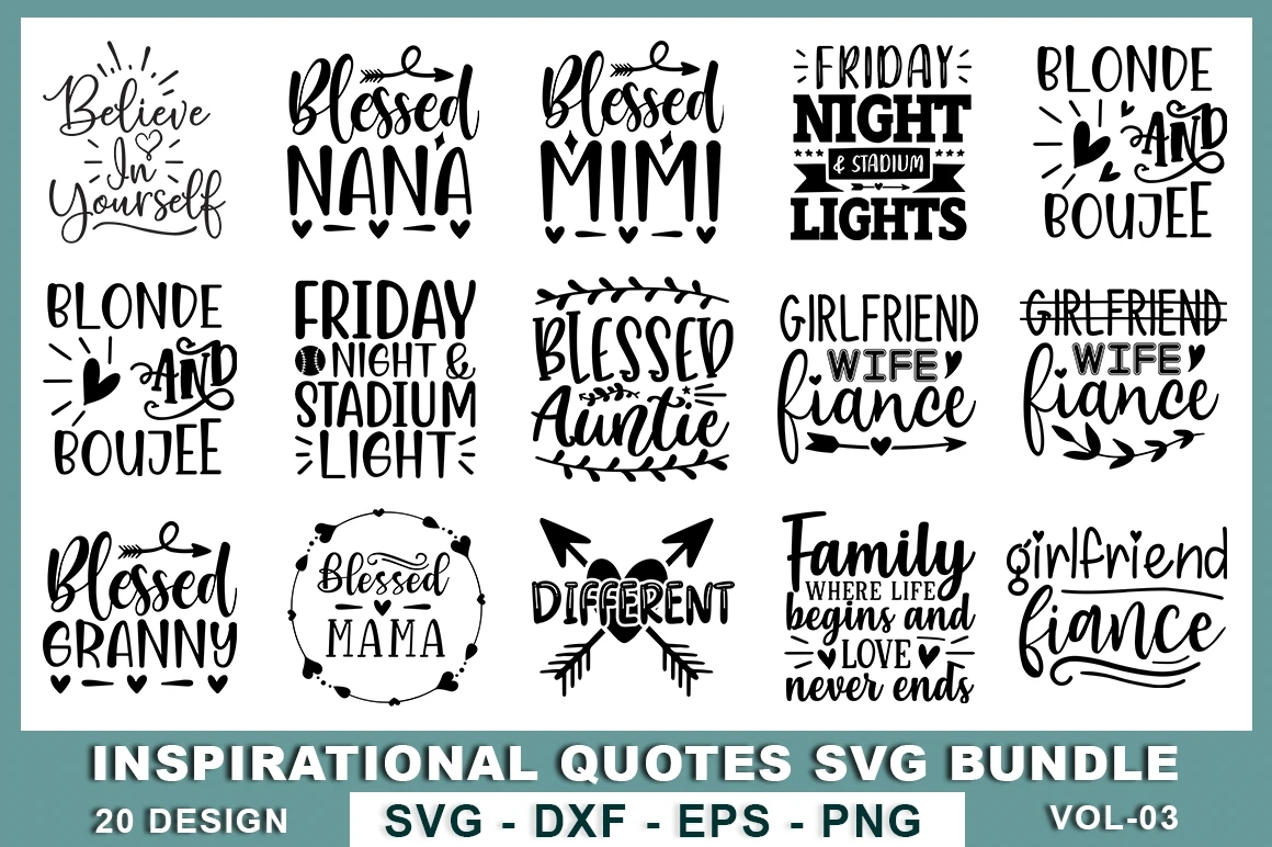 This bundle includes 20 Inspirational Quotes Designs.