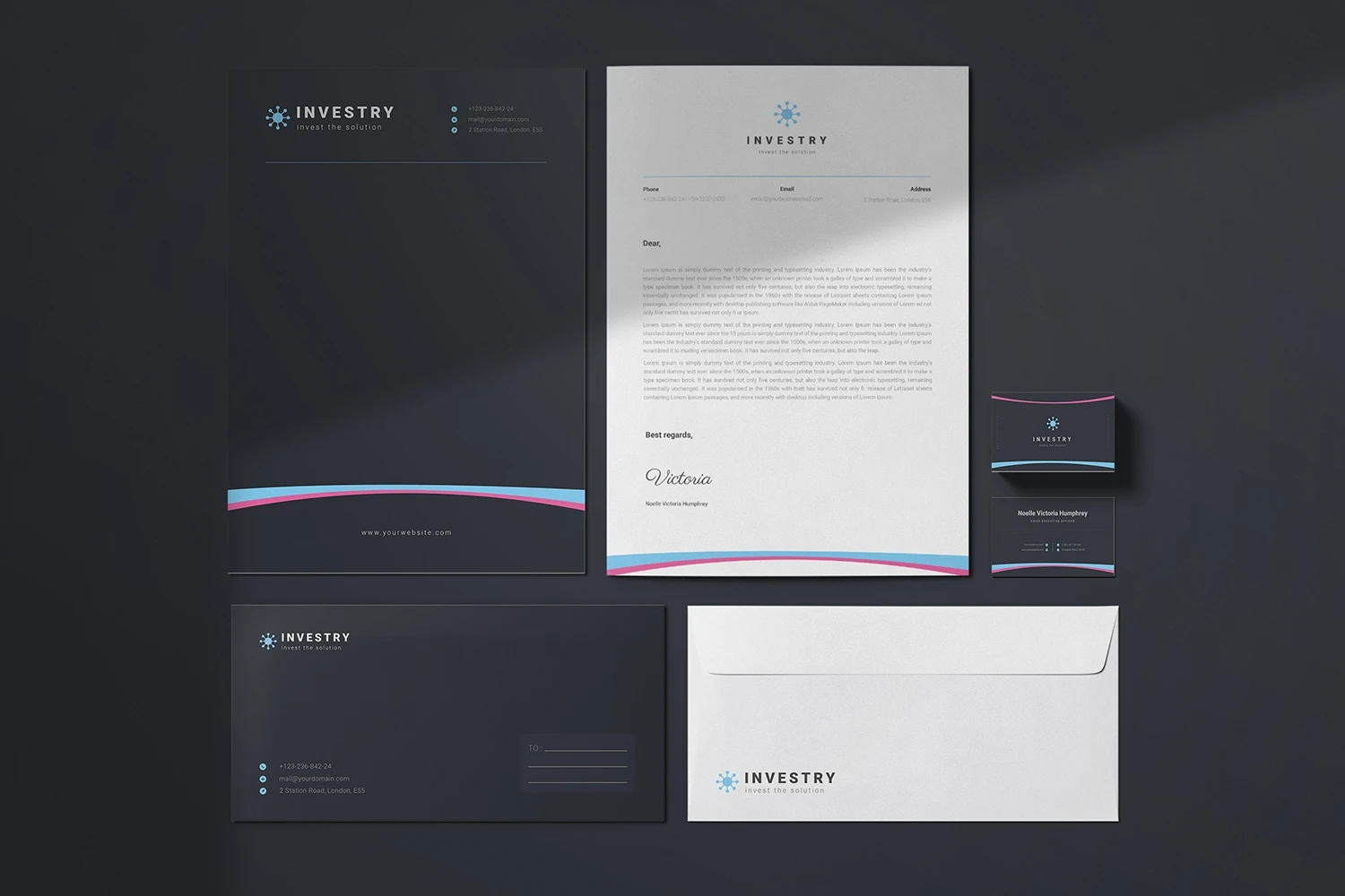 Investry Company - Stationary. This template is great for your business and this design will make your interested, elegant, and easily editable according to your needs. I hope you enjoy for this stationary.