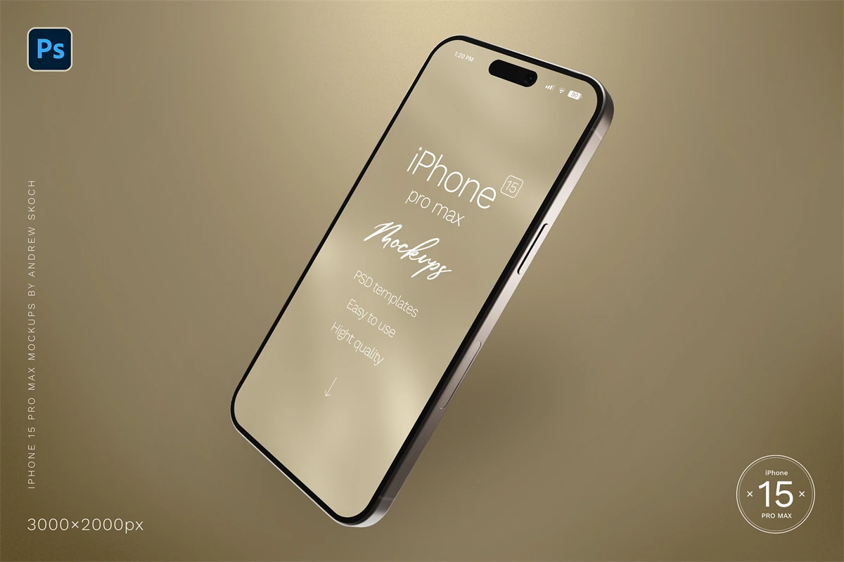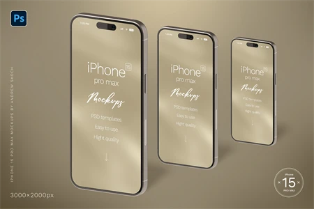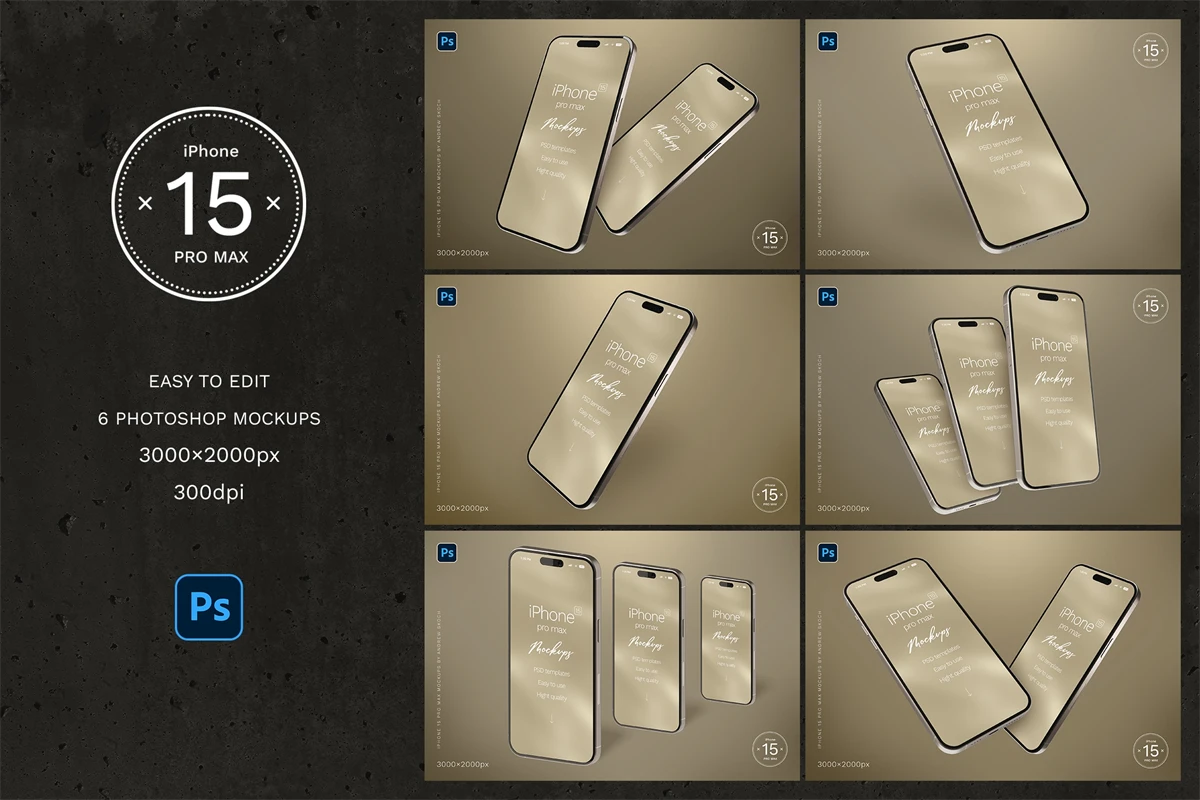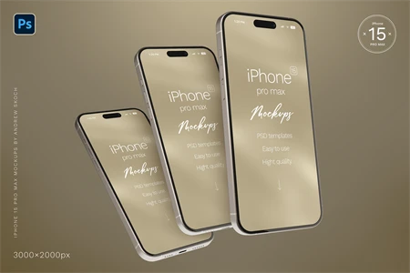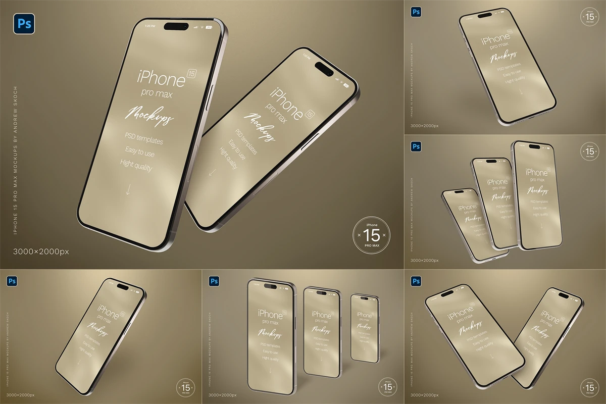 High quality iPhone 15 pro max mockups. 6 Photoshop mockups, 30002000 pixels, 300 DPI