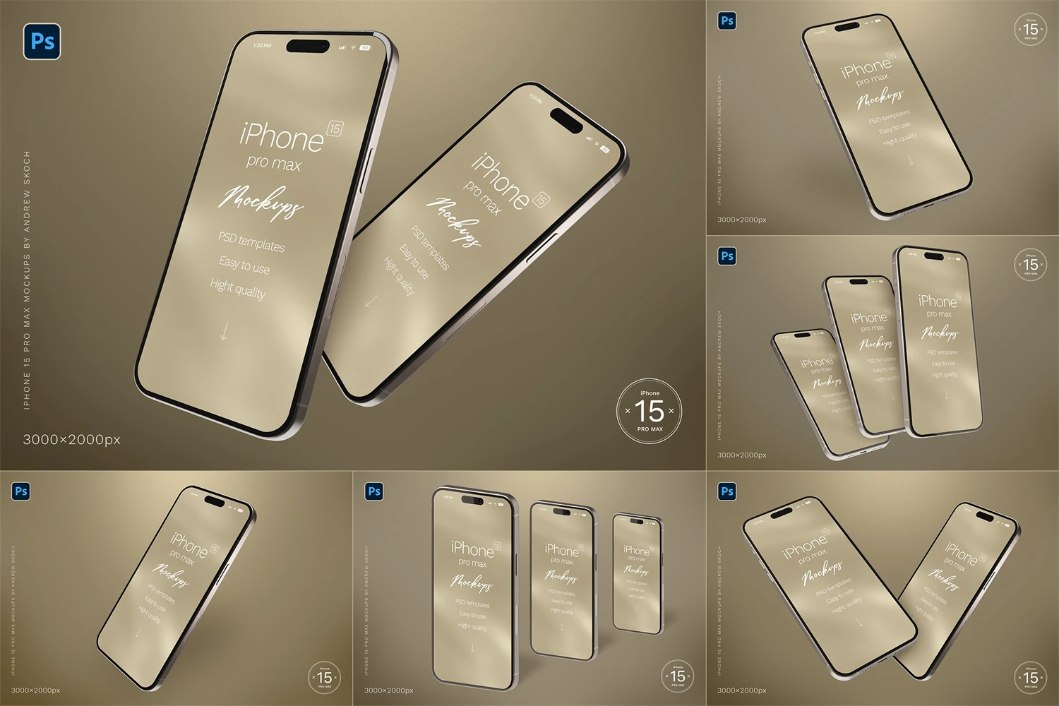 6 scenes with iPhone 15 pro max titan color smartphone on gold background. There are a lot of possibilities using iPhone mockups. You can change background or use isolated smartphones without background. You can use each smartphone separately. All elements placed in separate layers.