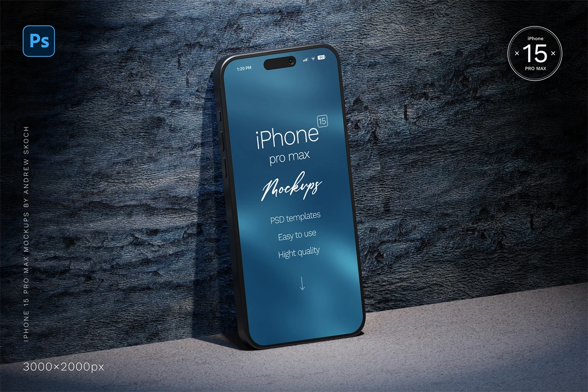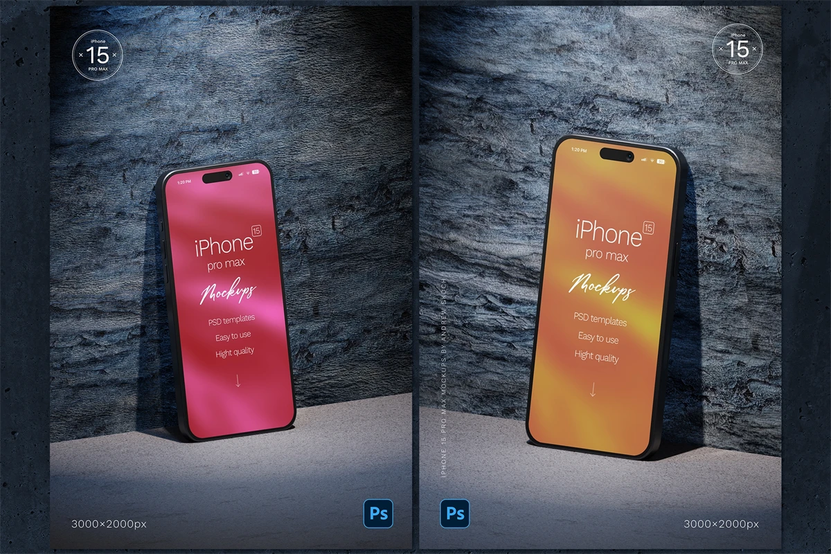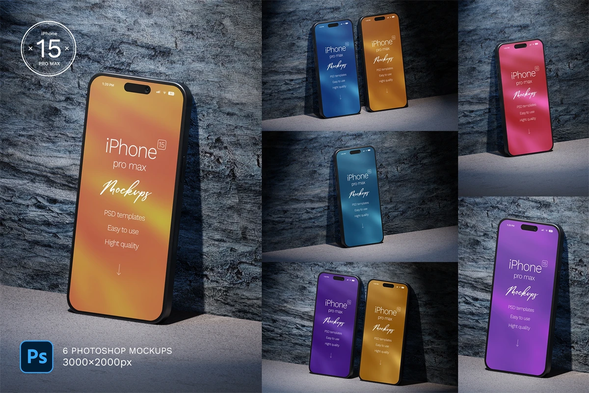 High quality iPhone 15 pro max mockups. 6 Photoshop mockups, 30002000 pixels, 300 DPI