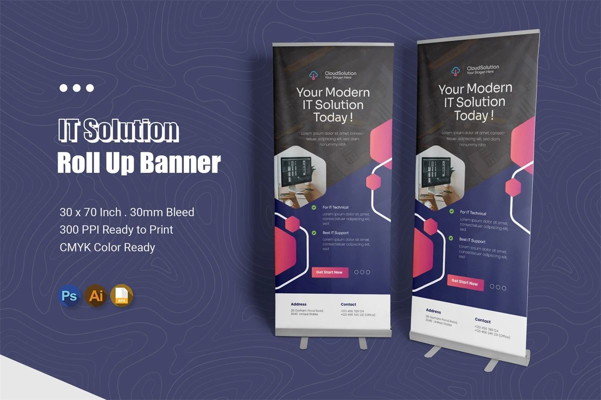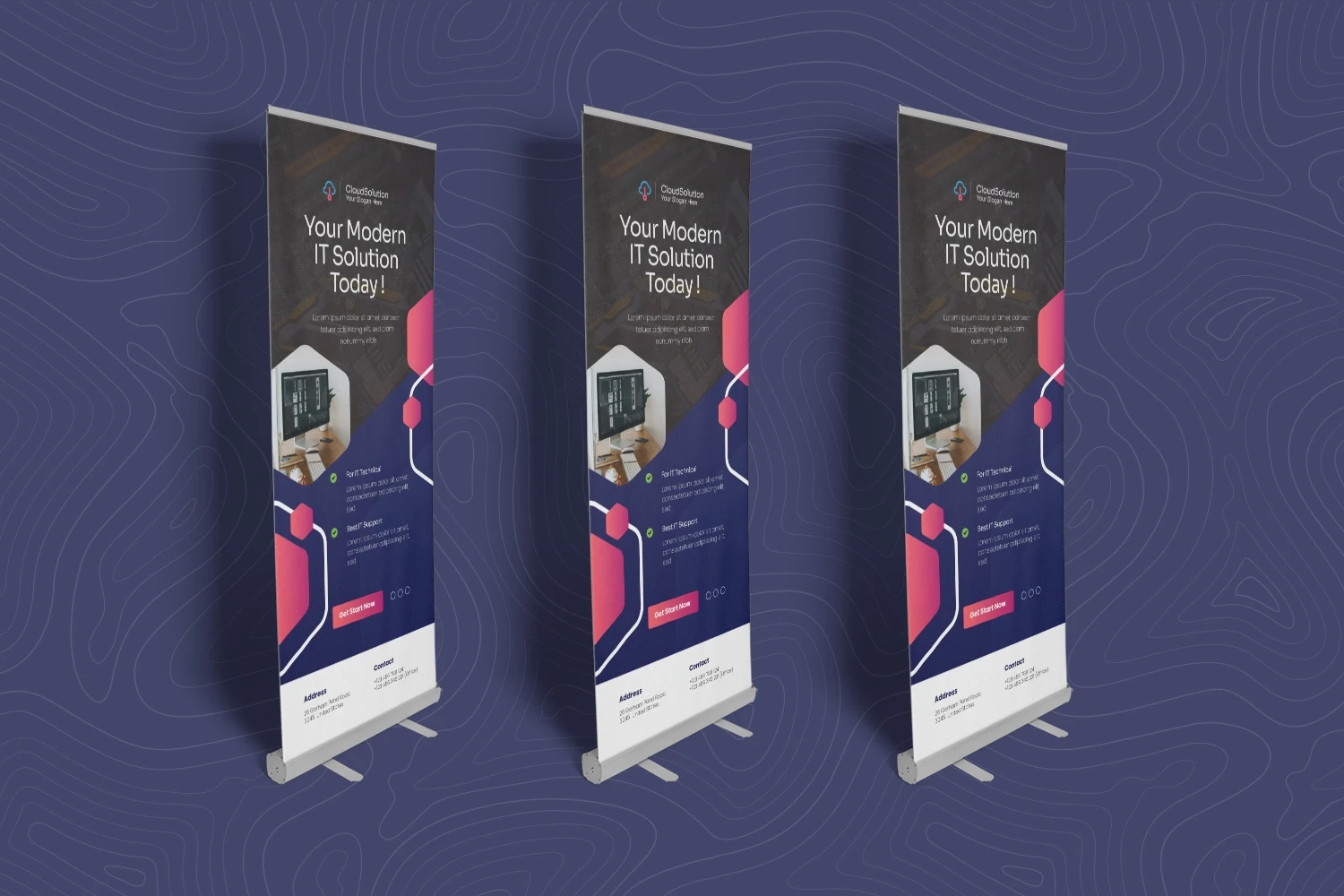 Our roll-up banner template tells your brand's story at a glance. This design stands out and can be used to showcase pictures and content effectively.