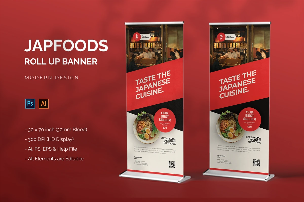 This is **Japfoods - Roll Up Banner** Don't wait, get it right now! , All Your Roll-Up Banner Needs, Professional or Personal. This stylish and adaptable template is perfect for your company's promotional materials.
