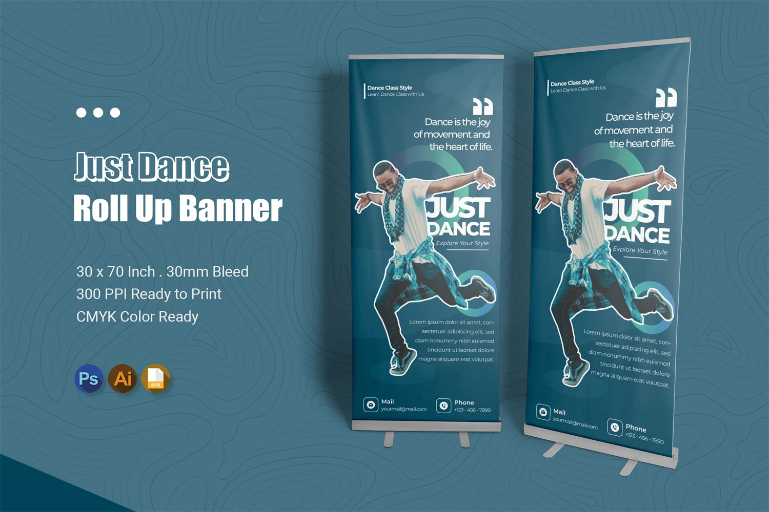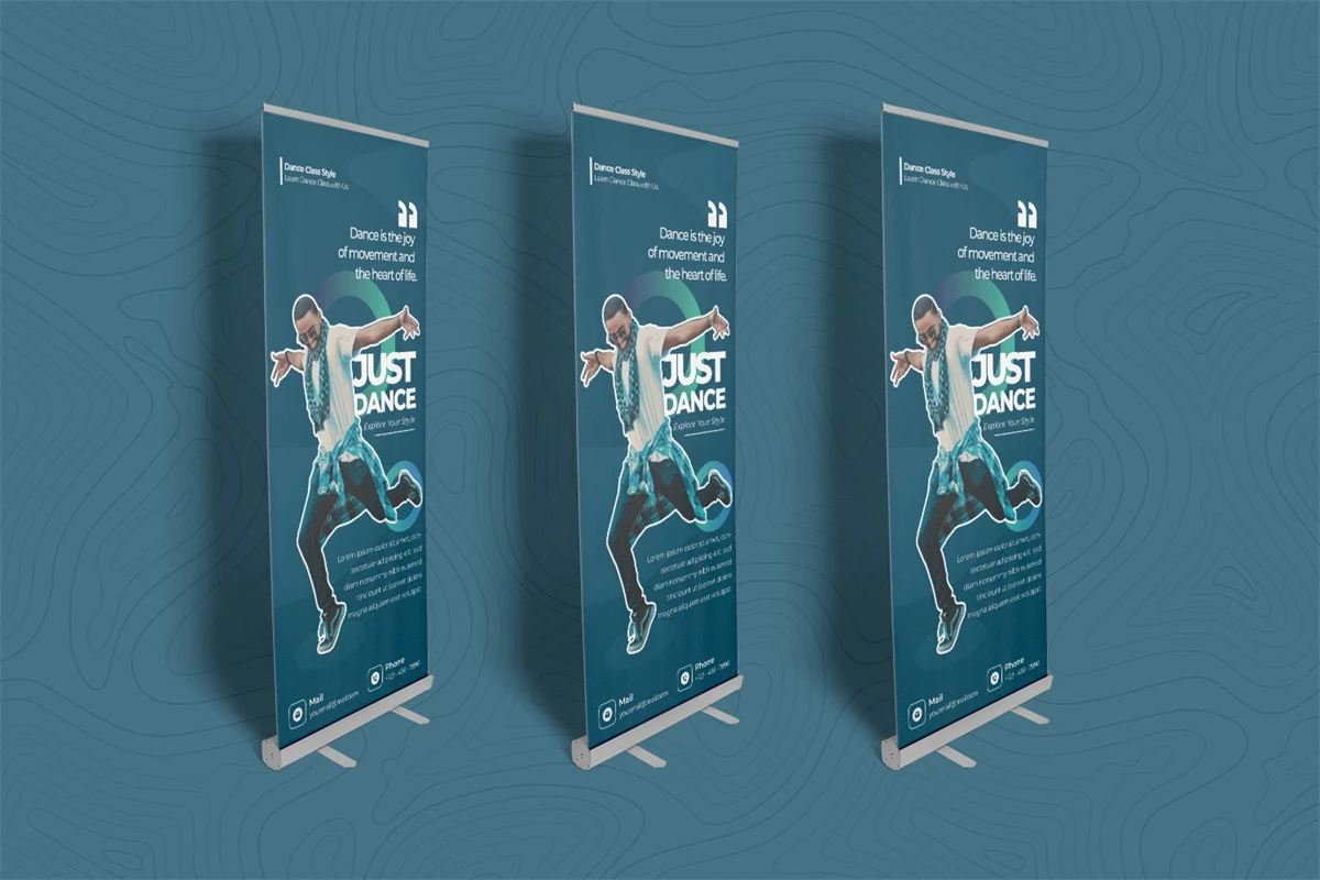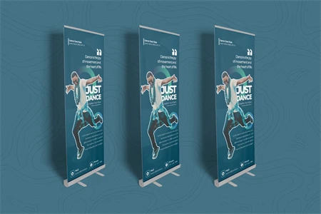 Our roll-up banner template tells your brand's story at a glance. This design stands out and can be used to showcase pictures and content effectively.