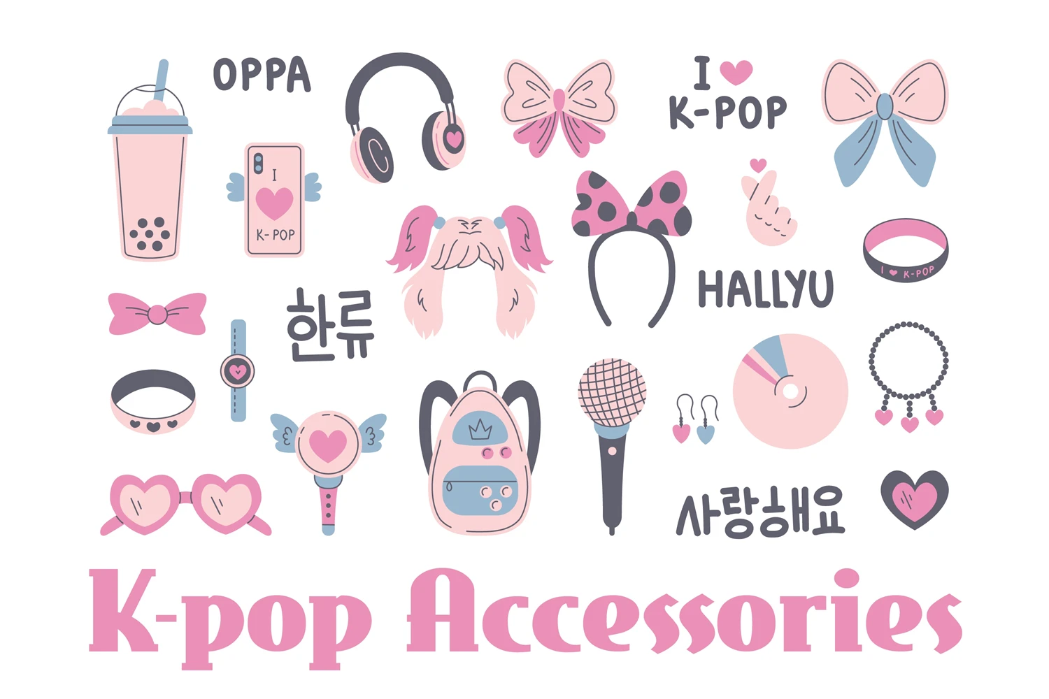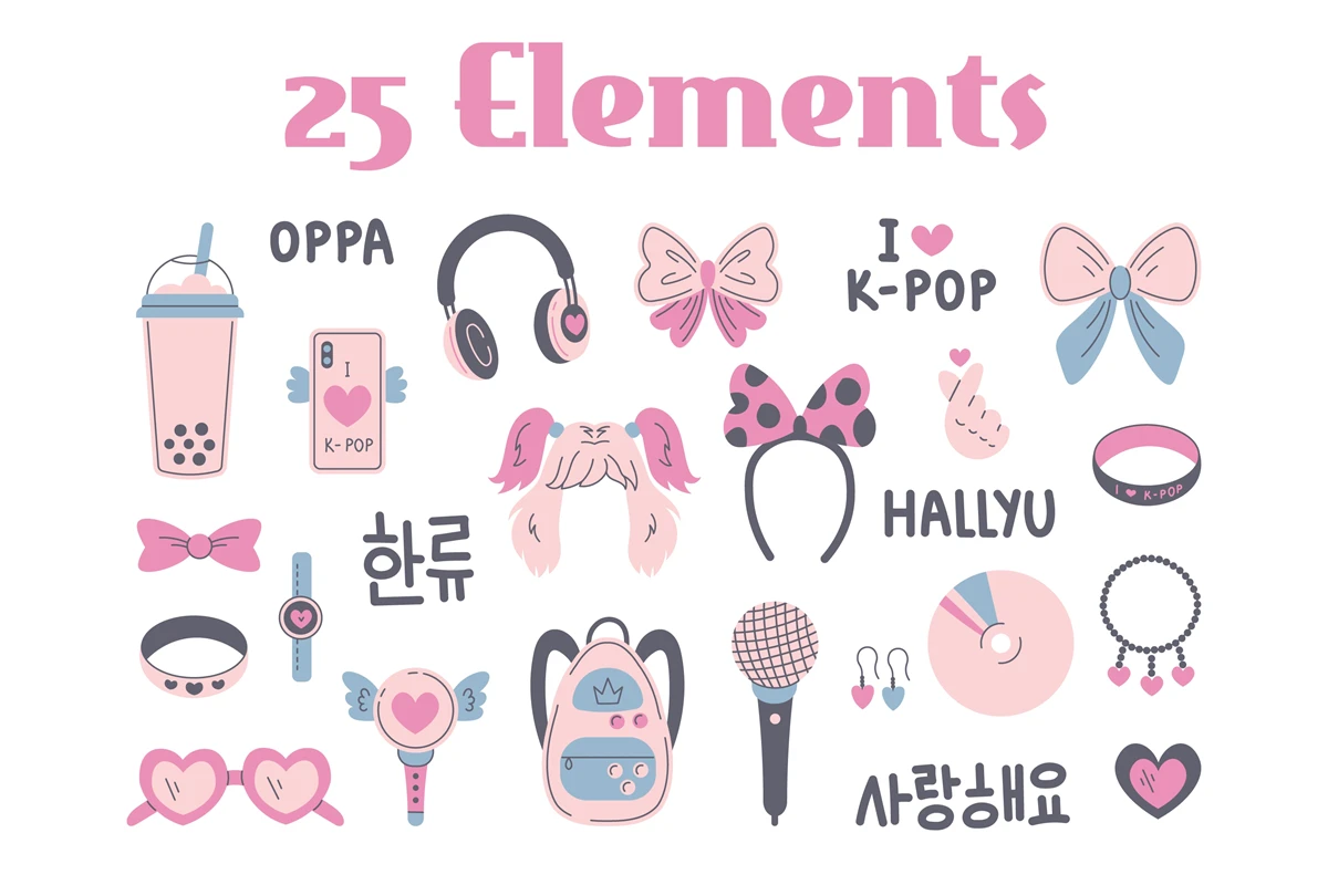 Colorful South Korean pop culture accessories. K-pop music items and words. Fan girl clipart for woman. Vector illustration in flat and cartoon style. Perfect for greeting card, invitation, party, web site design, social media, stickers, kids.