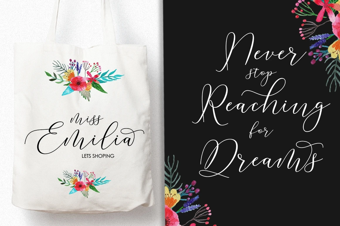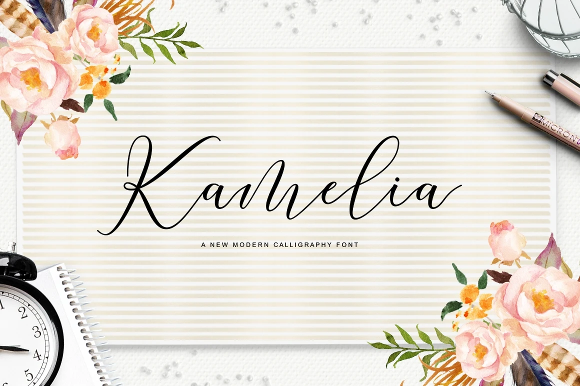 Kamelia Script is modern calligraphy design, including Regular and Bold Script. This font is elegant and pretty with swashes. Can used for various purposes. such as logo, product packaging, wedding invitations, branding, headlines, signage, labels, signature, book covers, posters, quotes and more.