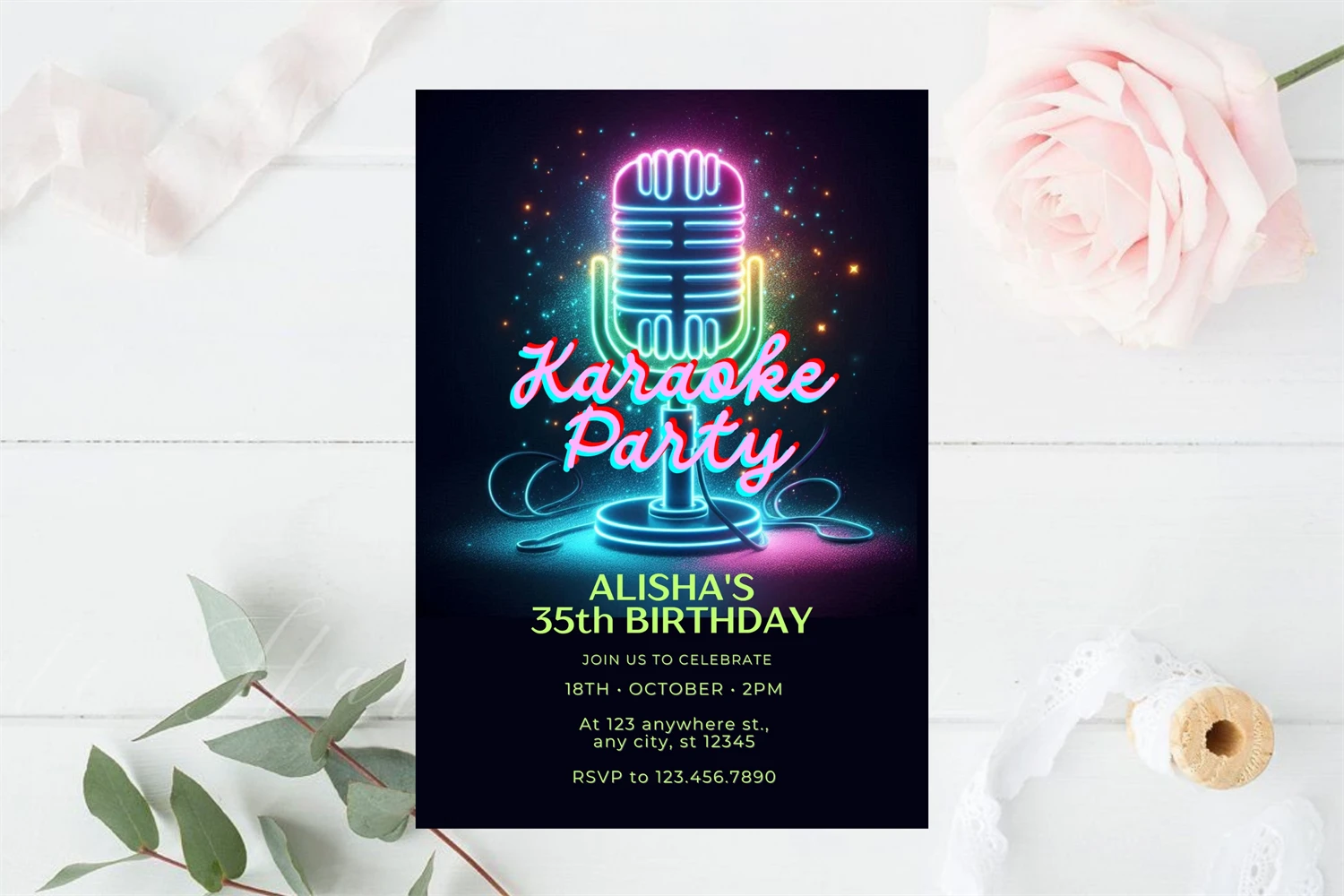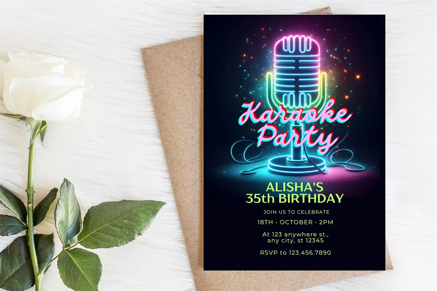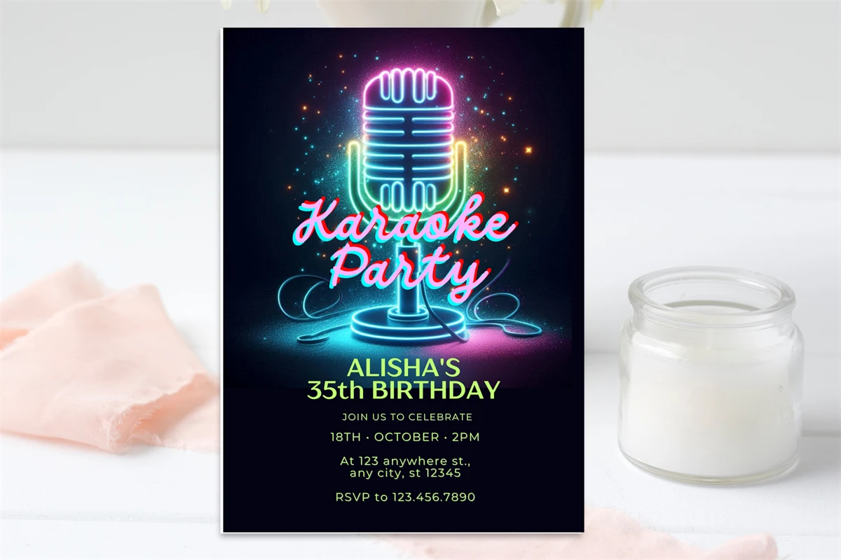 Perfect for any age, this invitation ensures everyone knows its time to grab the mic and celebrate!