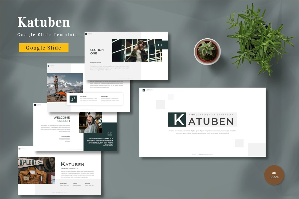 Get it now! **Katuben - Google Slide Template** for All Business and Personal Needs All elements on this template are editable; input your content, replace your image with a placeholder, change the color, and all presentations include an animated slide to present your slides.