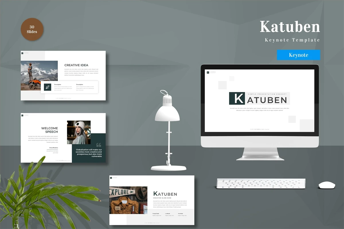 Get it now! **Katuben - Keynote Template** for All Business and Personal Needs All elements on this template are editable; input your content, replace your image with a placeholder, change the color, and all presentations include an animated slide to present your slides.