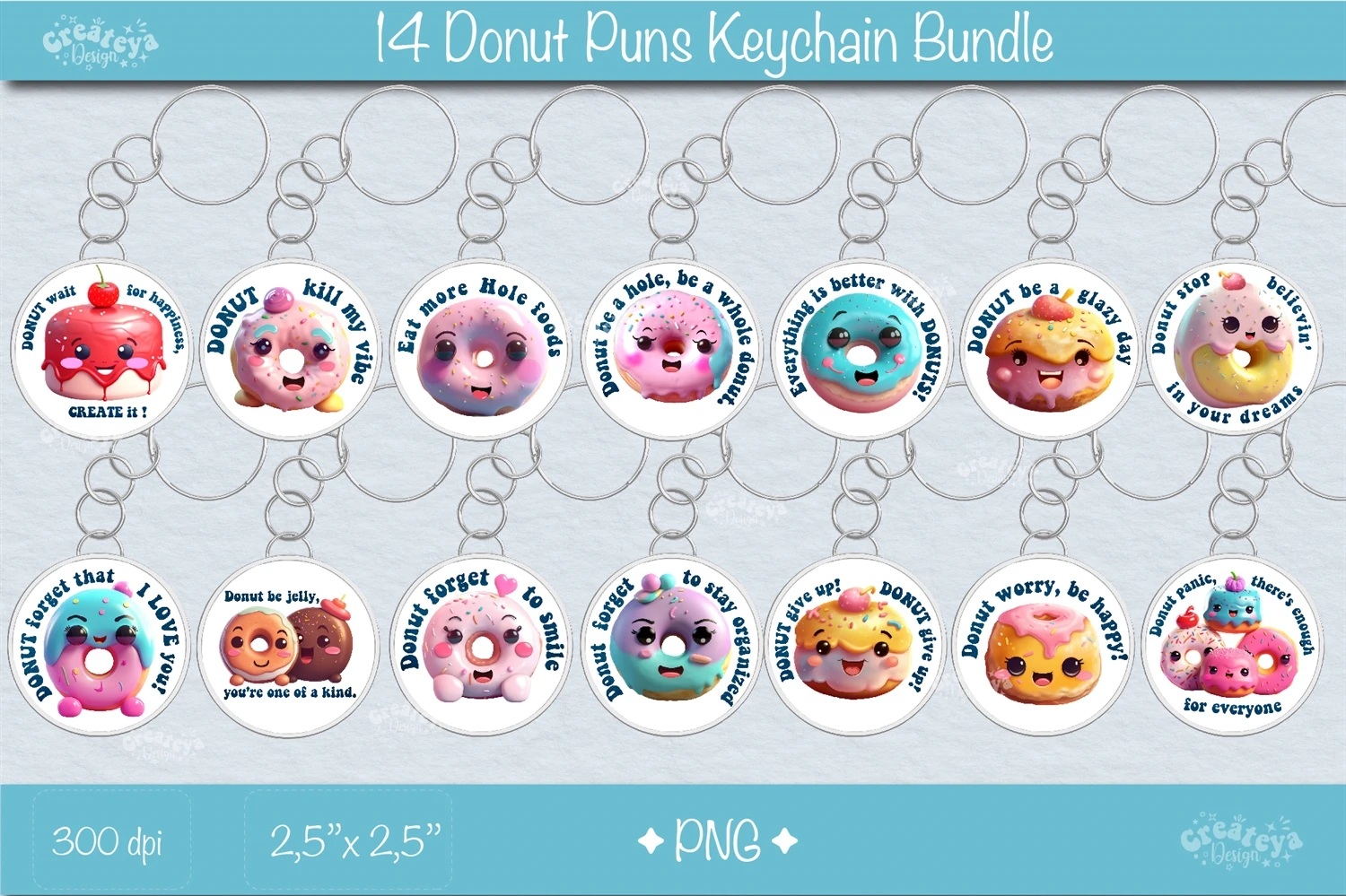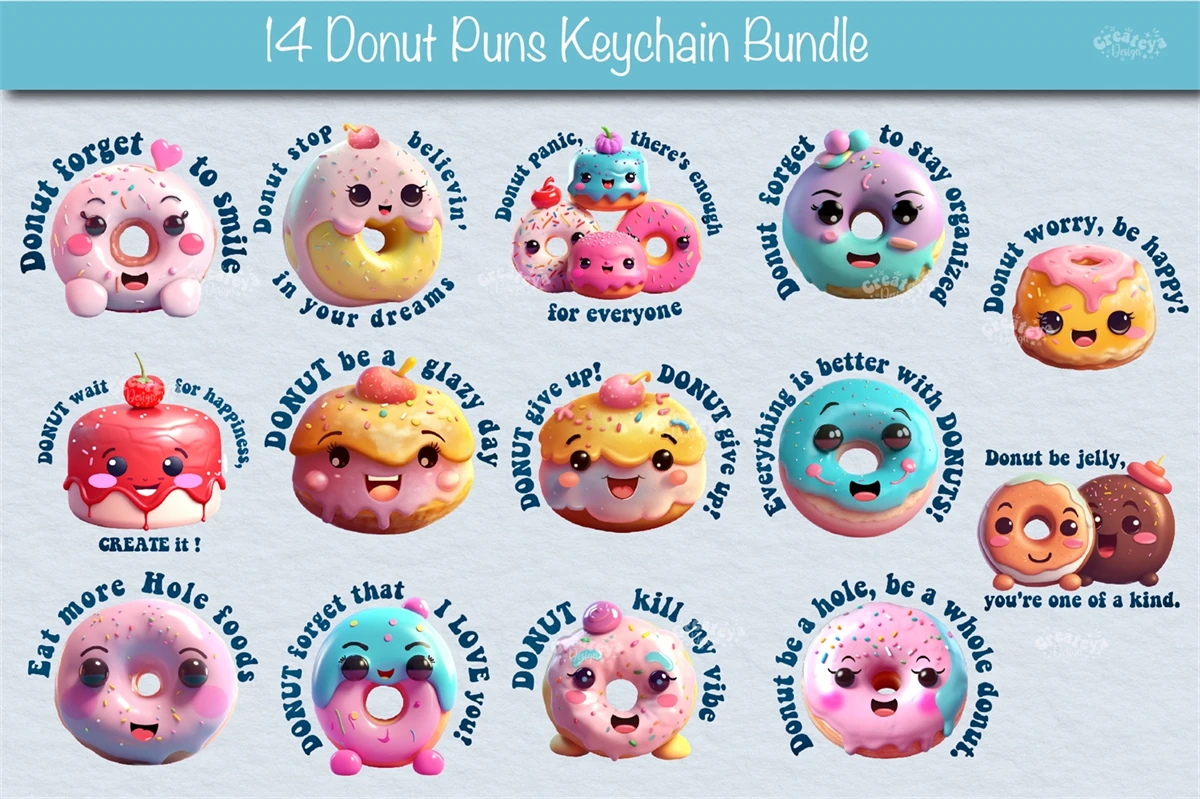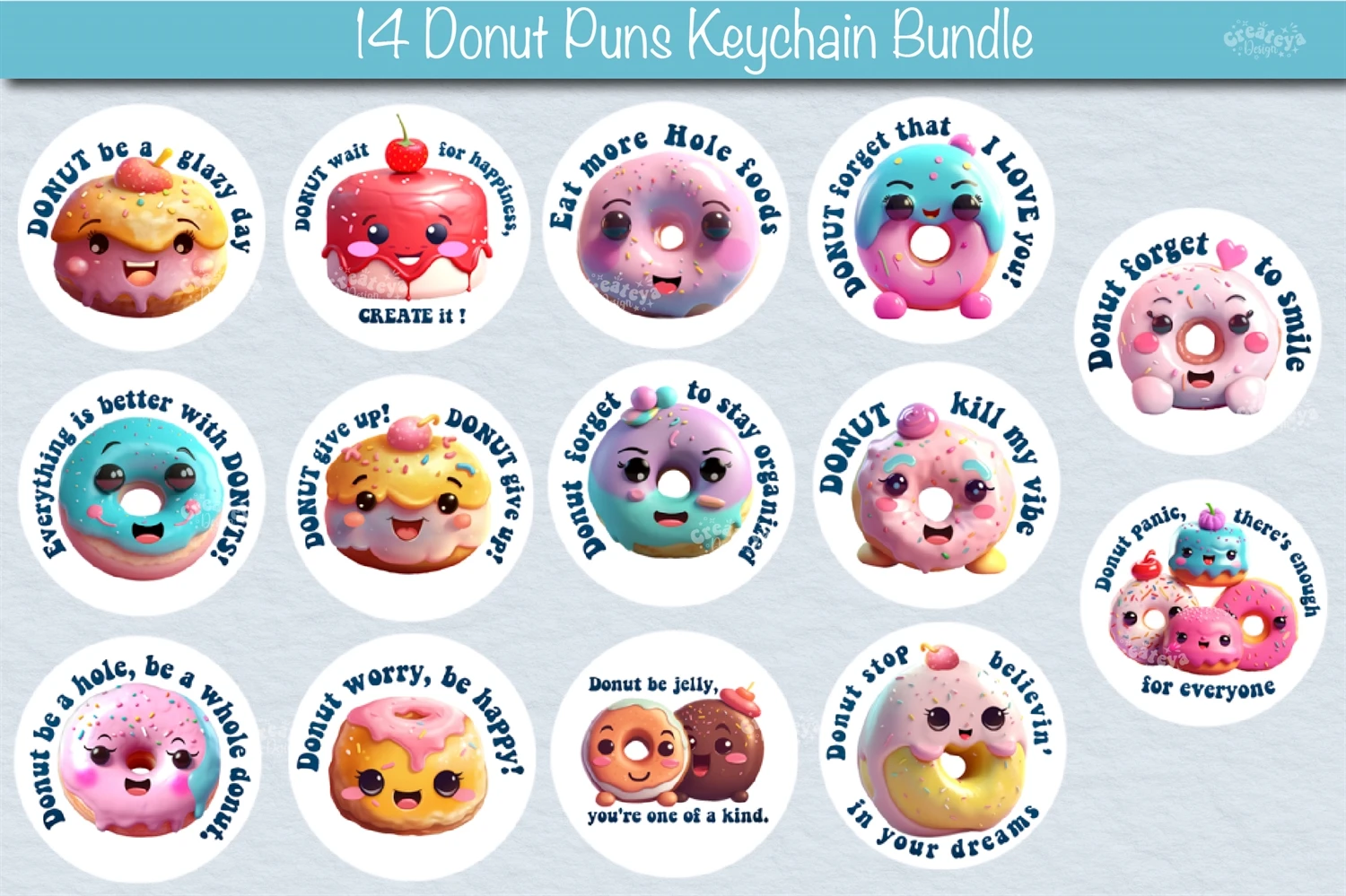This sublimation design will be great to create a keychain! Colorful Kawaii Donut Pun Keychains are great for print and cut! Each keychain shows an adorable donut and a funny sarcastic or inspirational and motivational saying to go with it.