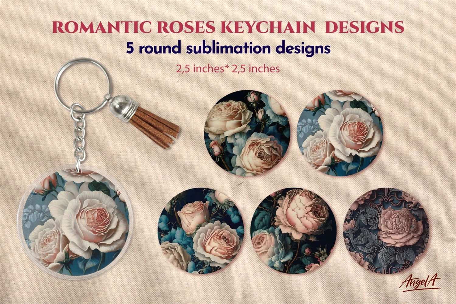 This keychain bundle includes 5 circle keychain sublimation designs with Romantic roses. Also you can use this keychain bundle as car coaster sublimation designs, round earring sublimation designs. Also you can use these sublimation keychain designs for t shirt design, badge, pin, pillow and other your project!