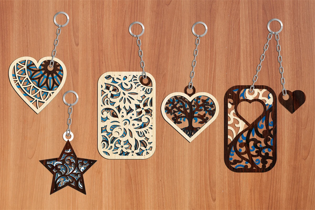 Keychains Digital multilayer layout files are specially prepared for the laser cut, CNC router machine and other cutting machines.