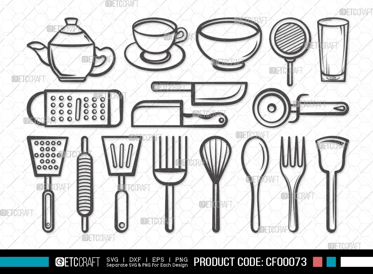 Welcome to our "Kitchen Outline Cooking Utensils" SVG Cut File Bundle, a perfect companion for every cooking enthusiast and creative mind. This bundle brings you a curated collection of kitchen utensil outlines, ready to spice up your culinary-inspired projects.
