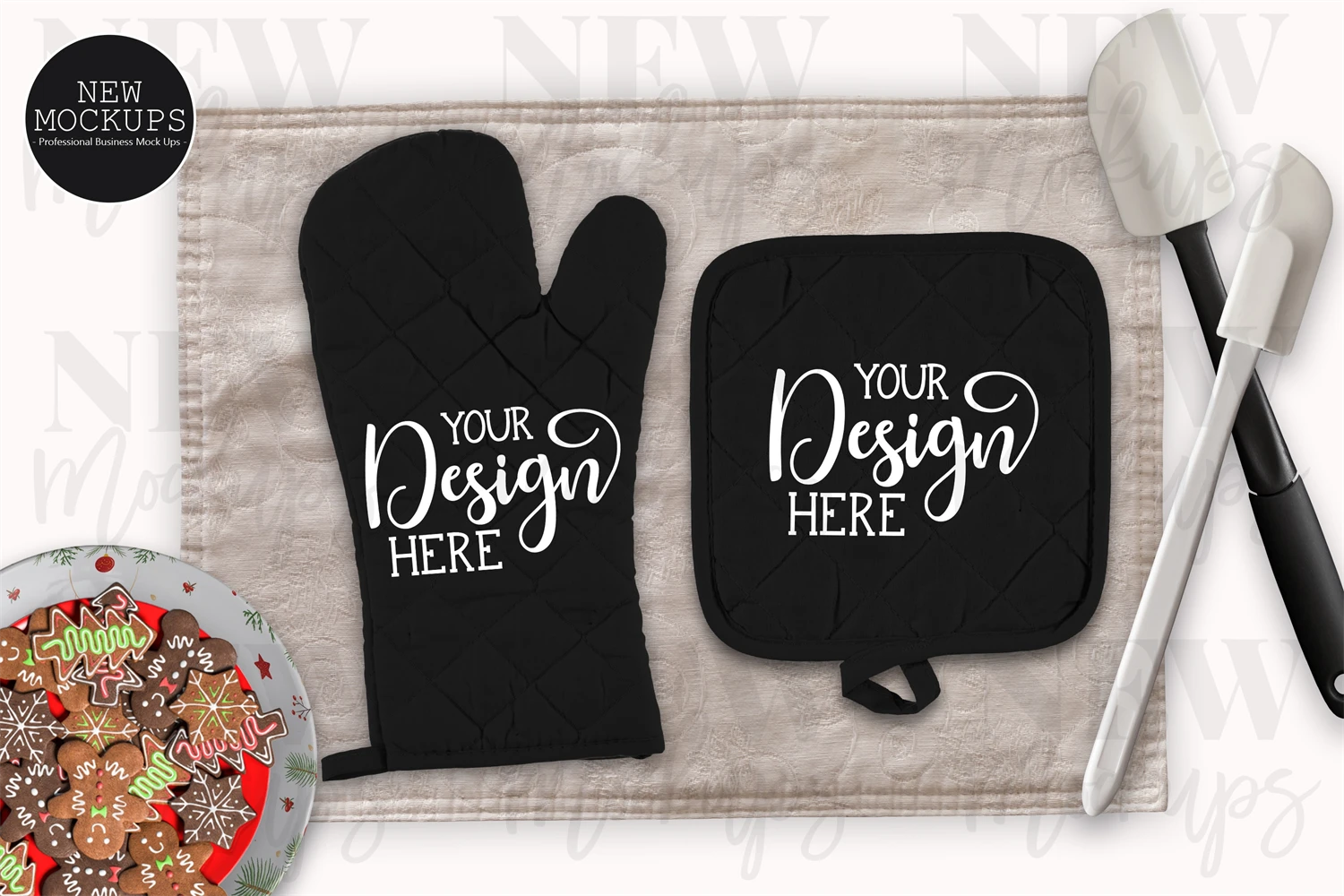 Kitchen Potholder, Oven mitt, Black Christmas Mockup with plate and cookies on white background