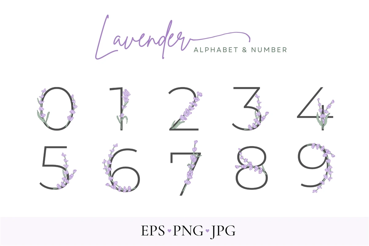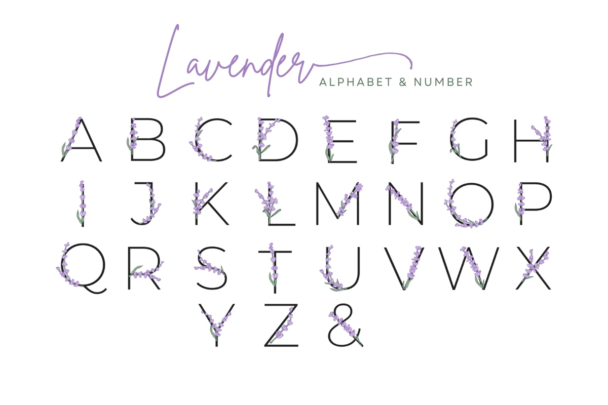 Lavender blossom violet little flower alphabet and numbers for design of card or invitation