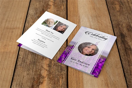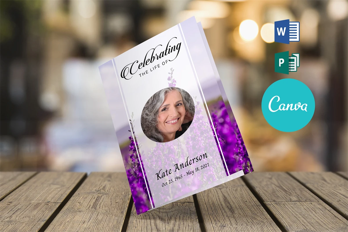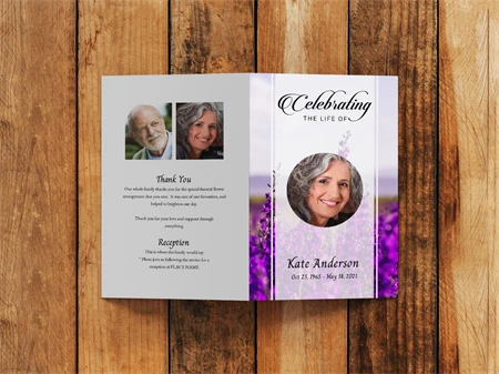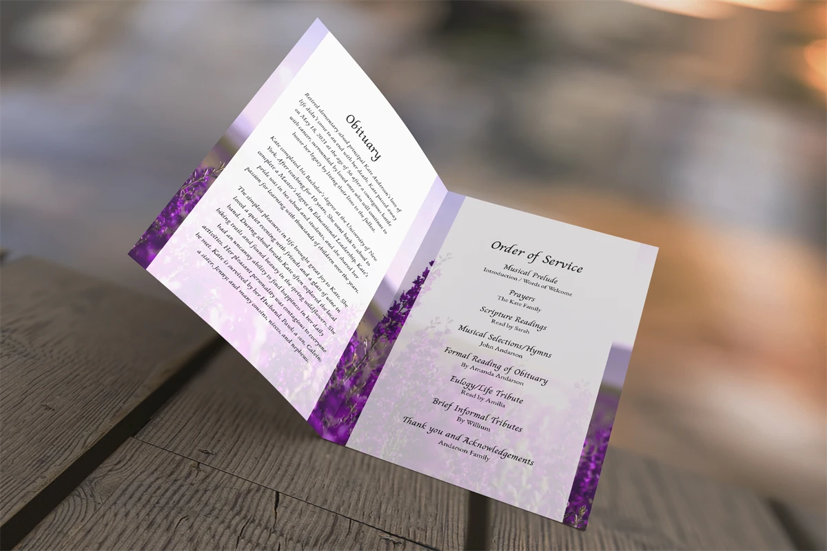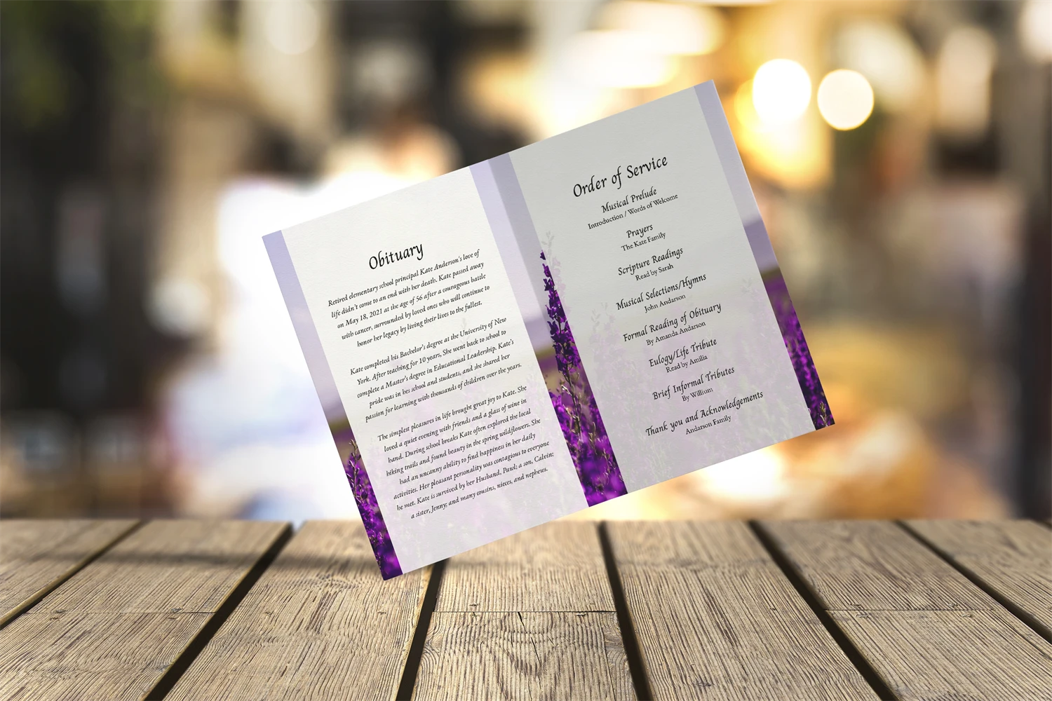 Funeral program template 4 page for women with Lavender Garden Background. This template is a great way to honor your loved one.