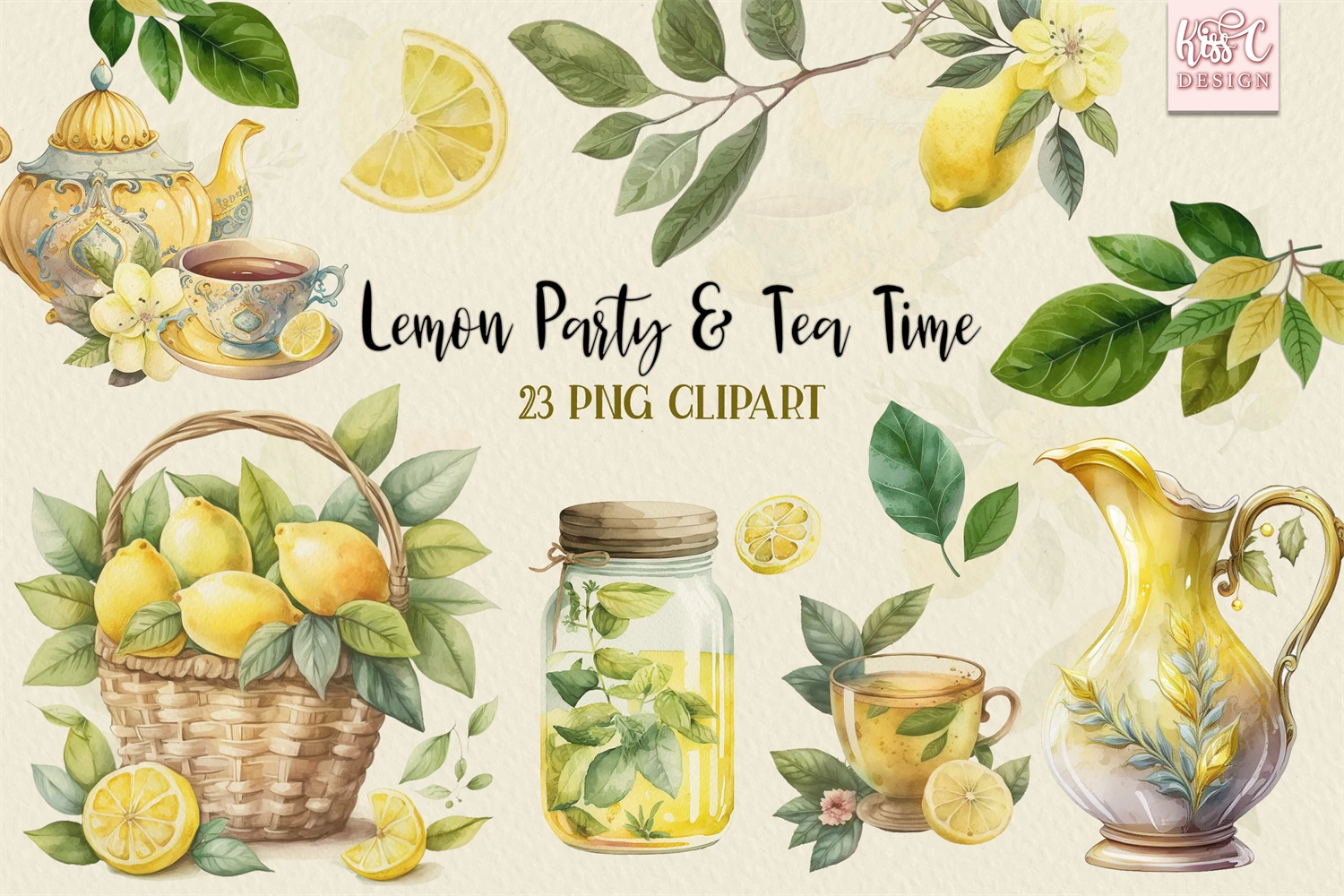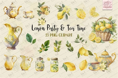 Lemon Party and Lemon Tea Set Watercolor Clipart Bundle