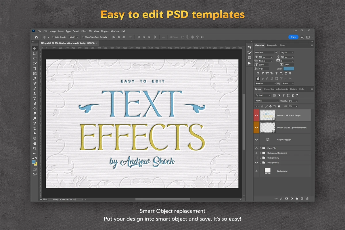 Use these 6 Photoshop templates for social media, Instagram, Facebook, YouTube, covers and posts, video titles and movie covers, branding and more. Edit texts via smart objects. It's so easy!