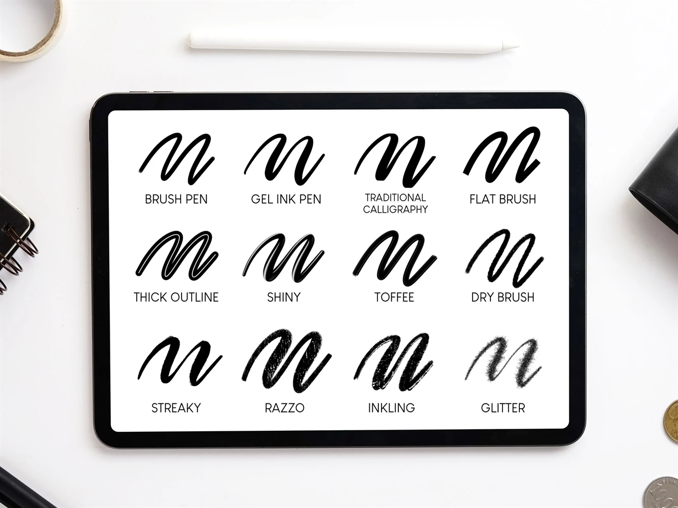 Calling all lettering and calligraphy lovers! The Lettering Lovers Procreate Brush Set comes with 12 brushes designed for iPad-based lettering and calligraphy. With brushes ranging from traditional calligraphy and gel pens to 3D and glitter pens , this set has something for all letterers. This brush pack is beginner-friendly and easy to use, making it ideal for those new to hand-lettering or calligraphy.