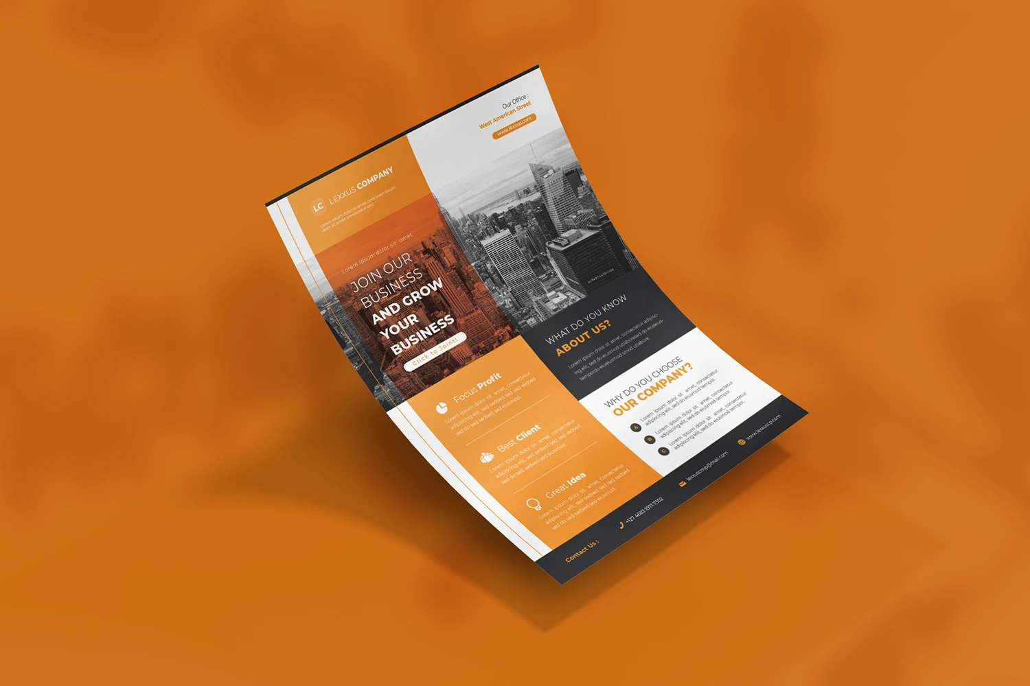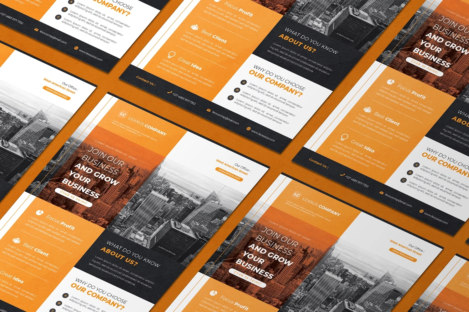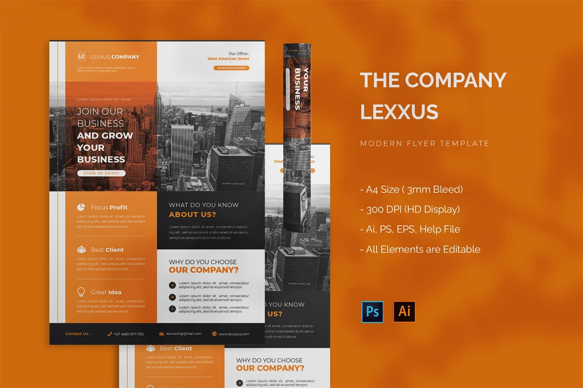 Lexxus Company - Flyer. This Flyer template is designed for your company's business needs. very clean and elegant, and also easily edited and adjusted to your liking