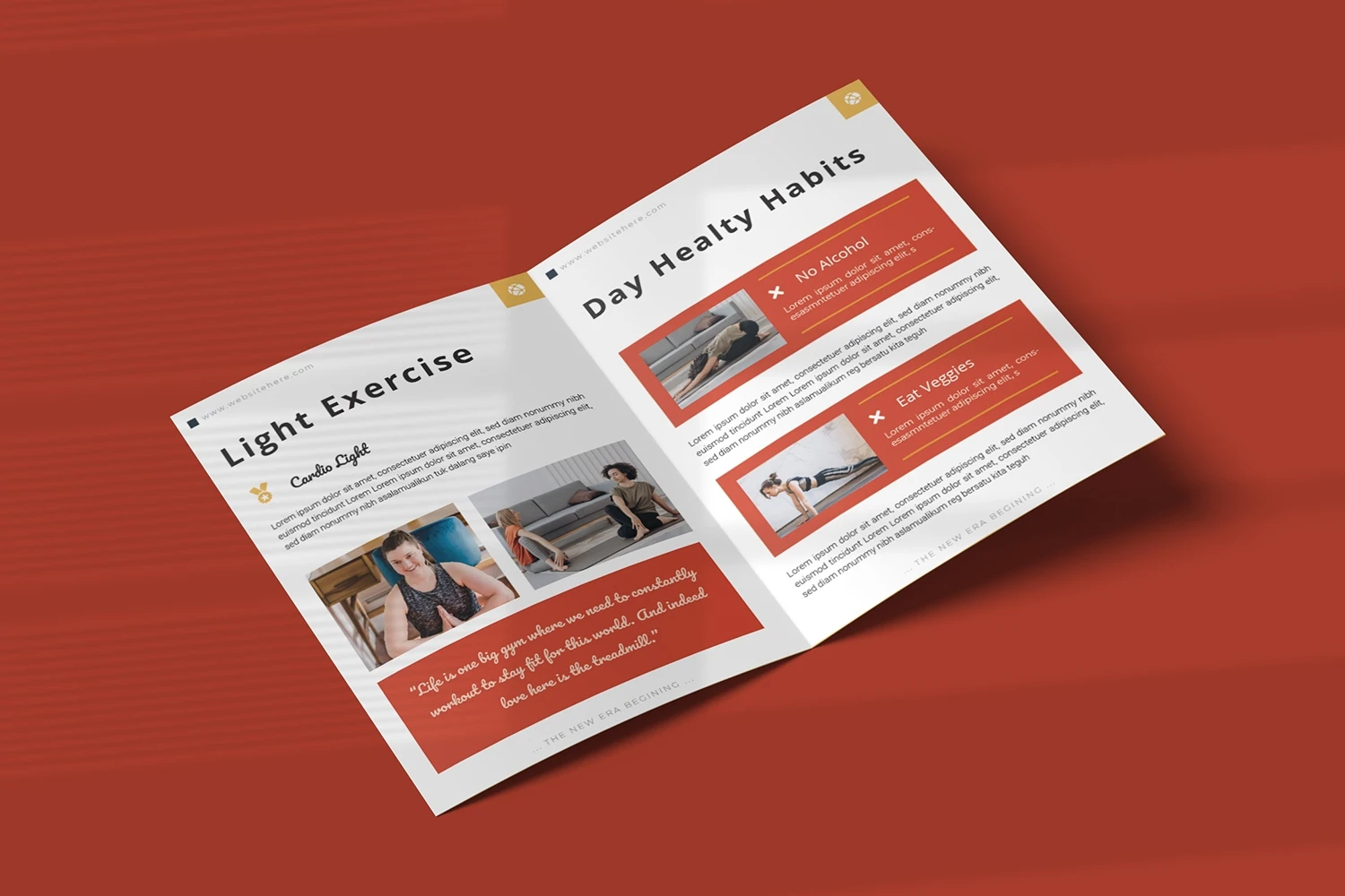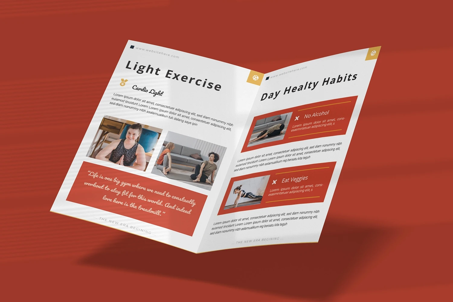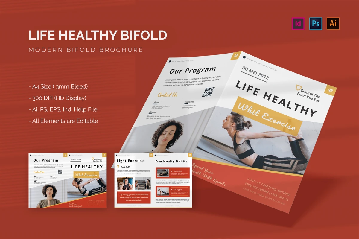 Life Healthy Whit Exercise - Bifold Brochure We present this Bifold Brochure for you, simple and very elegant, and this Bifold Brochure is suitable for all types of your business, made with Adobe InDesign (INDD), Adobe Photoshop (PSD) and Adobe Illustrator (AI), very easy to customize, Hope you Like it, dont forget to rate, Thanks.