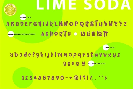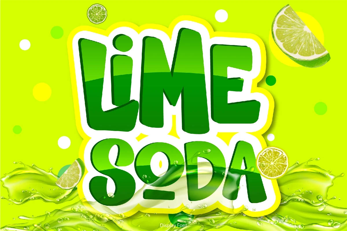 Lime Soda is a bold and quirky display font. Its friendly feel makes this font incredibly versatile, fitting a wide range of contexts. Add it to your creative ideas and notice how it makes them stand out!