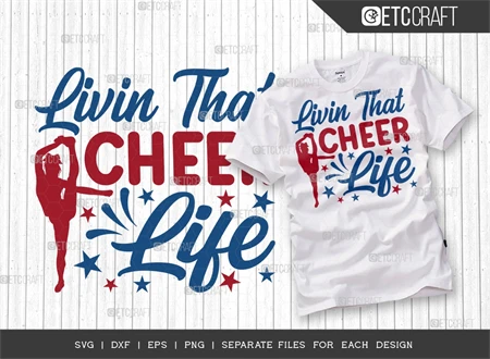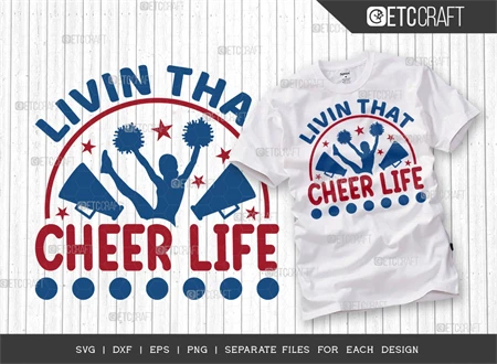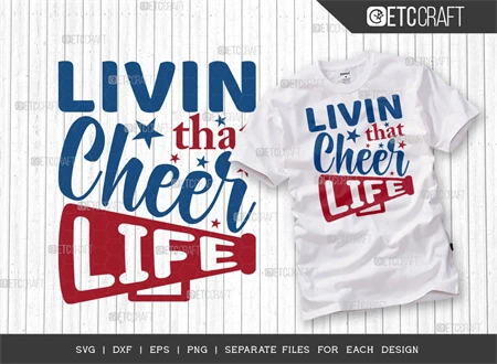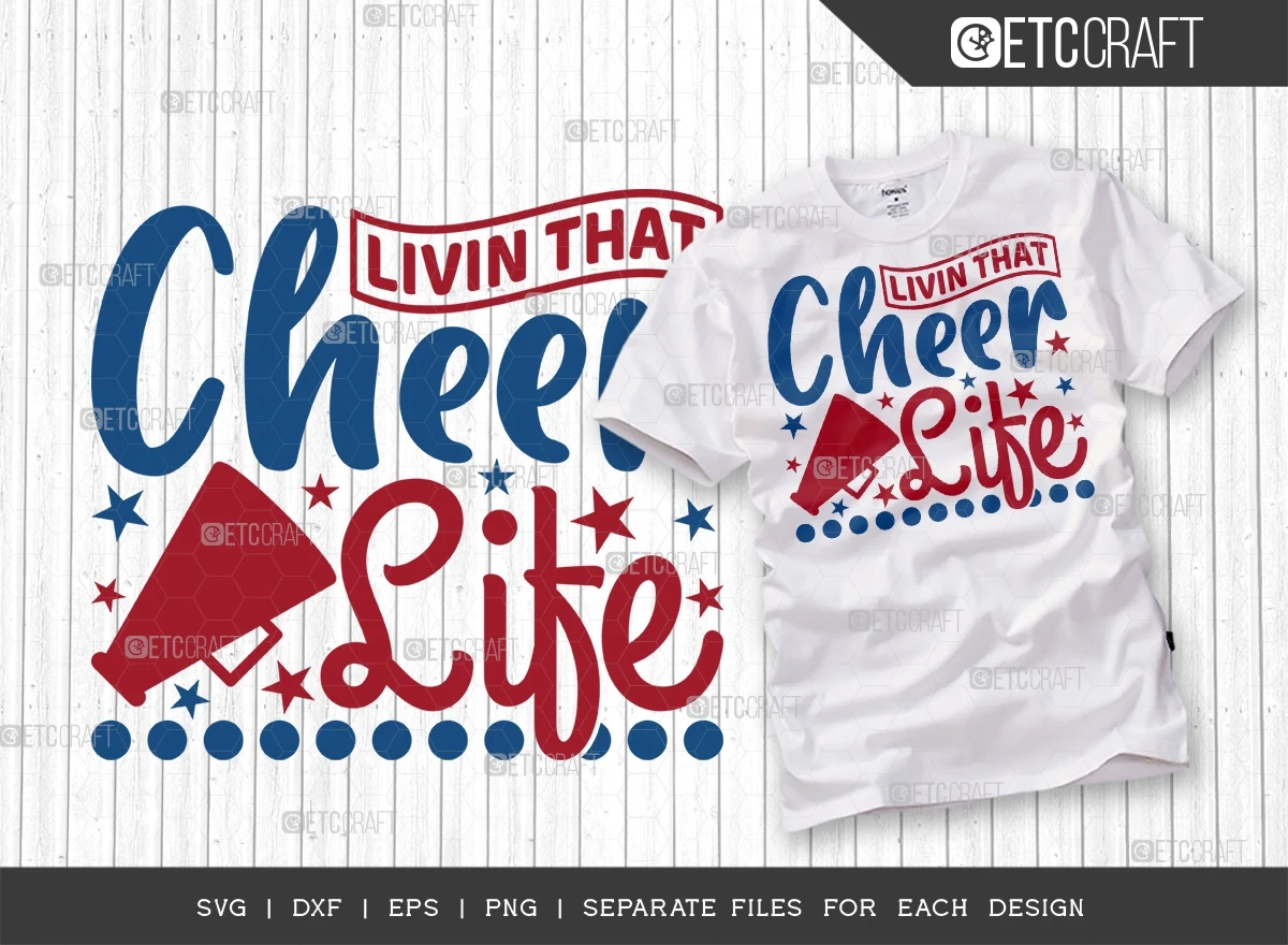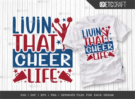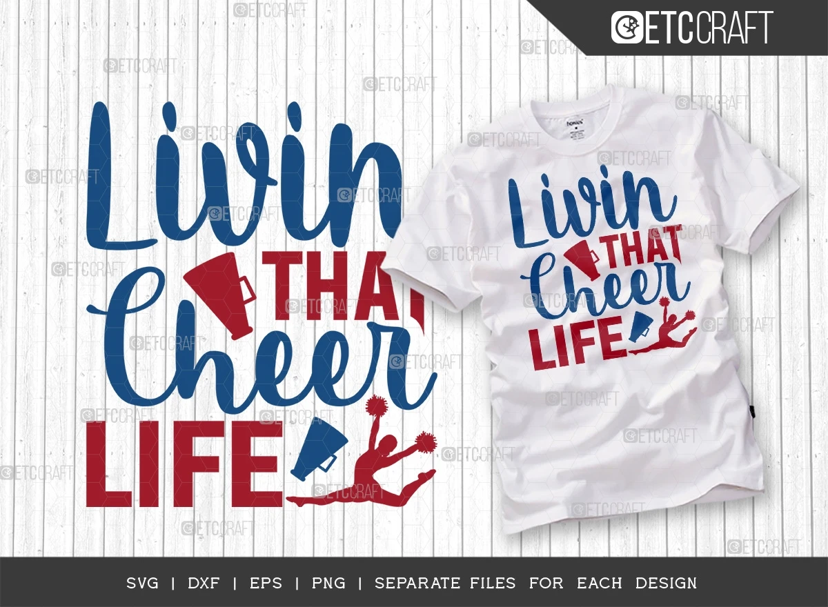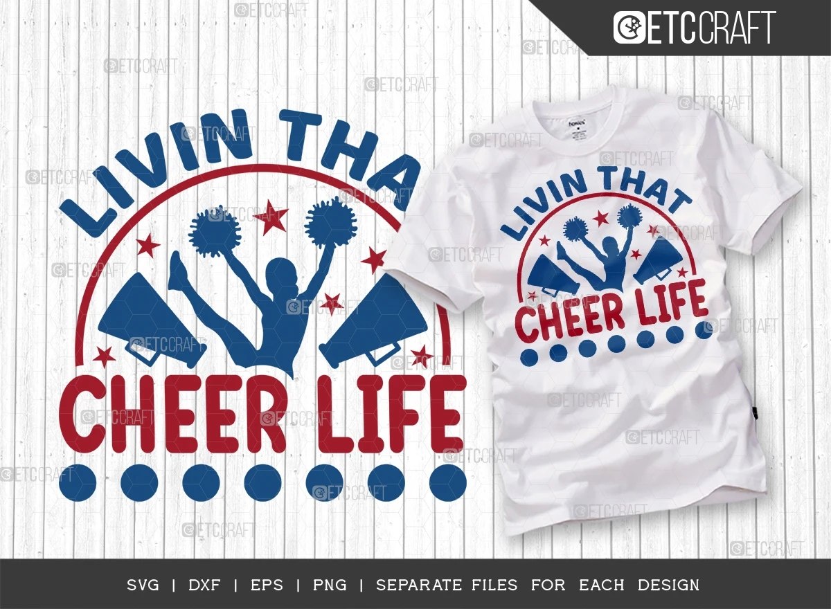 This exclusive Livin That Cheer Life SVG design & Its bold and vibrant graphics make a powerful statement and showcase your passion for cheerleading.