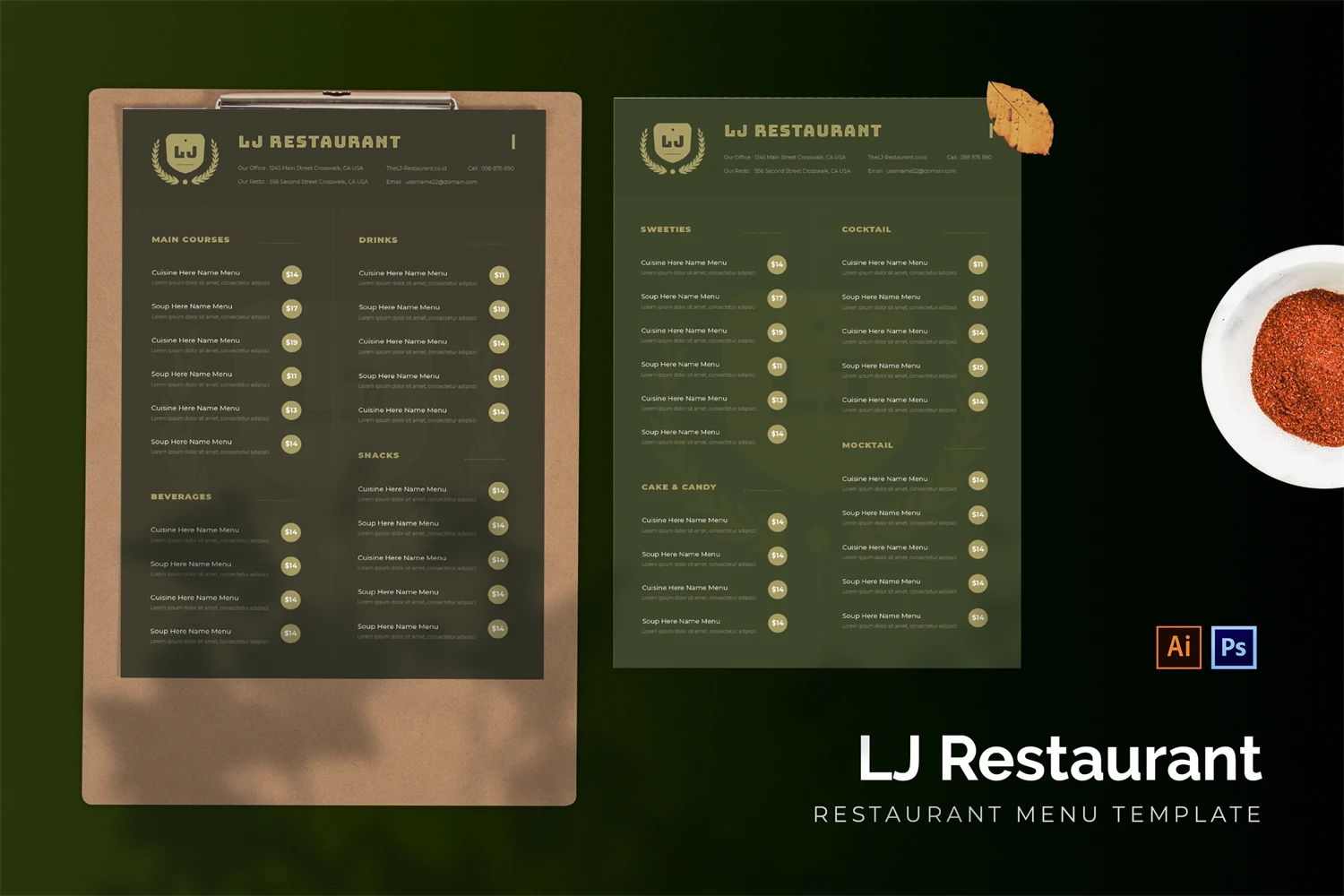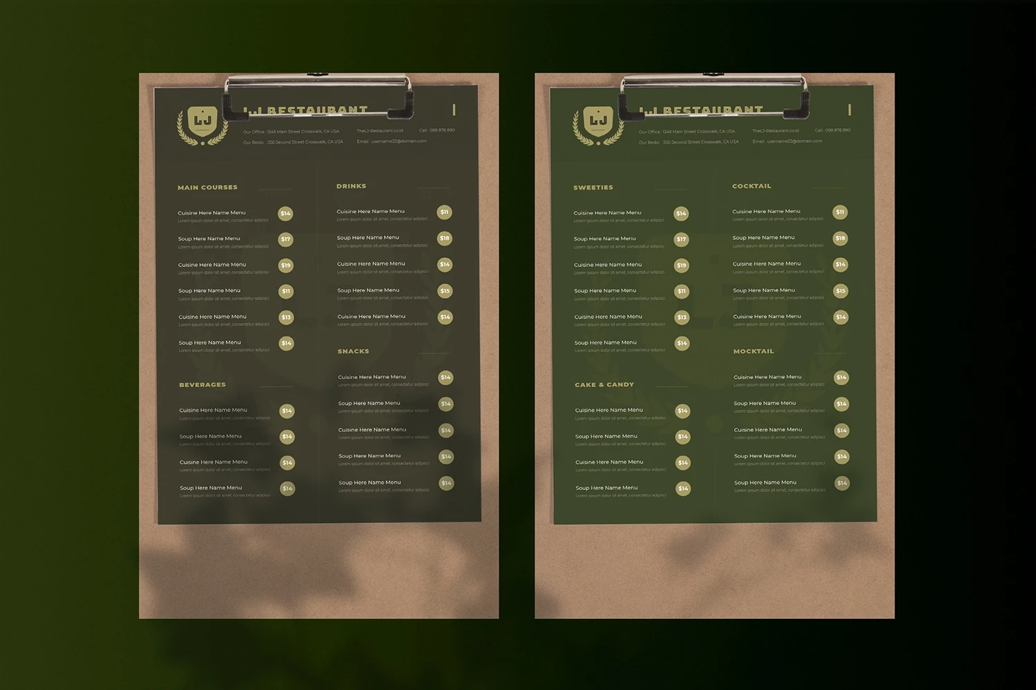 LJ - Restaurant Menu. This template is great for your business and will make your customers interested, elegant, and easily editable according to your needs, this restaurant menu is perfect for, promos, cafes, hotels, resort shops online. etc. I hope you enjoy this restaurant menu