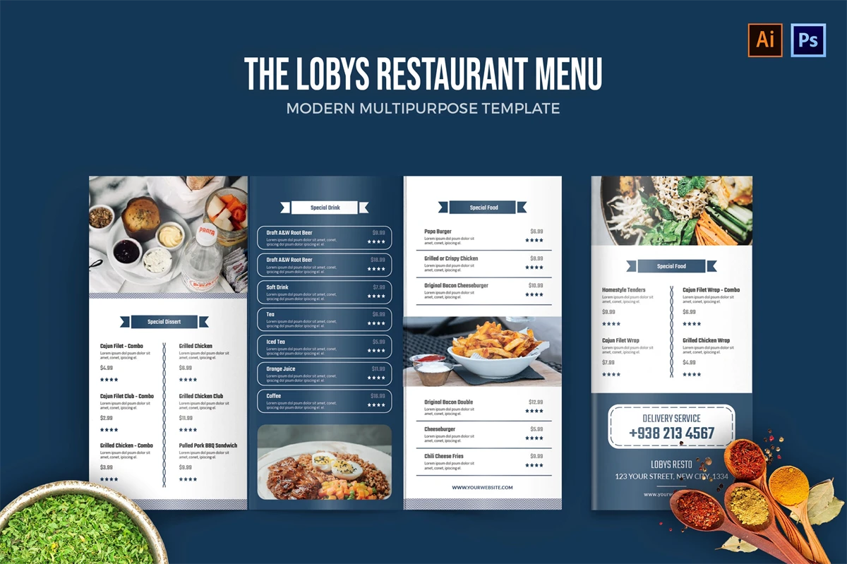 Lobys - Restaurant Menu. This template is great for your business and will make your customers interested, elegant, and easily editable according to your needs, this restaurant menu is perfect for, promos, cafes, hotels, resort shops online. etc. I hope you enjoy this restaurant menu