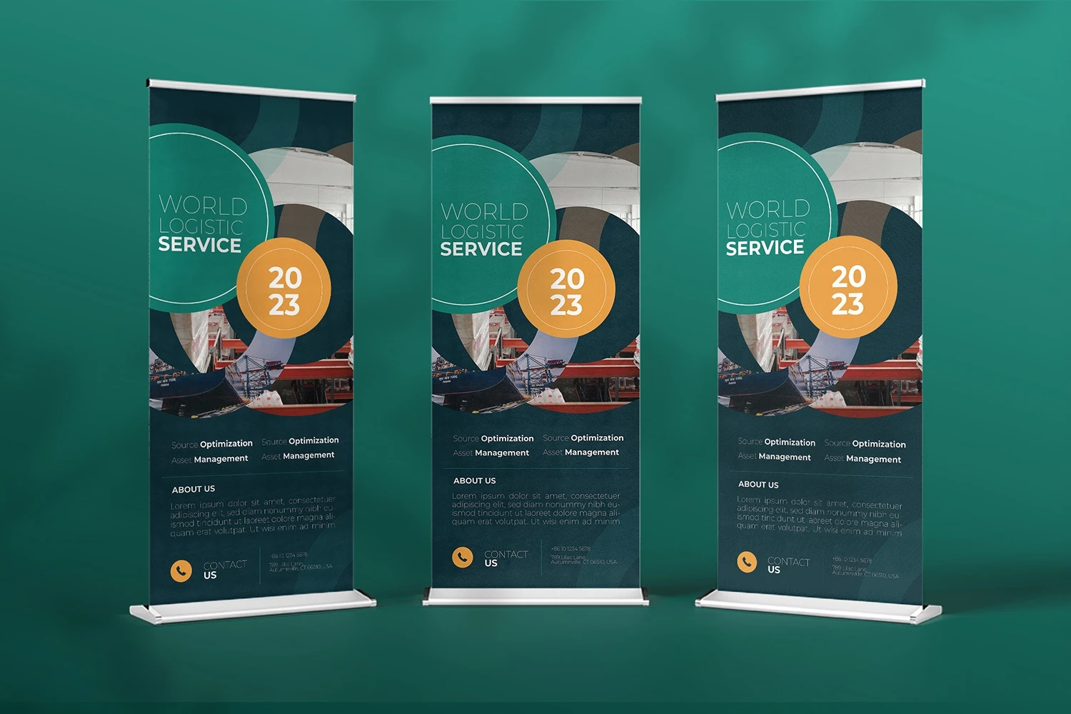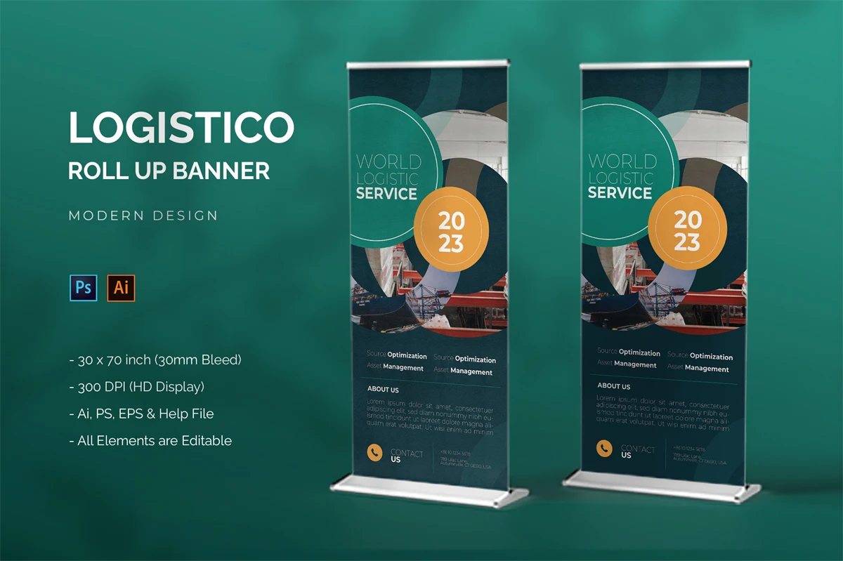 This is **Logistico - Roll Up Banner** Don't wait, get it right now! , All Your Roll-Up Banner Needs, Professional or Personal. This stylish and adaptable template is perfect for your company's promotional materials.