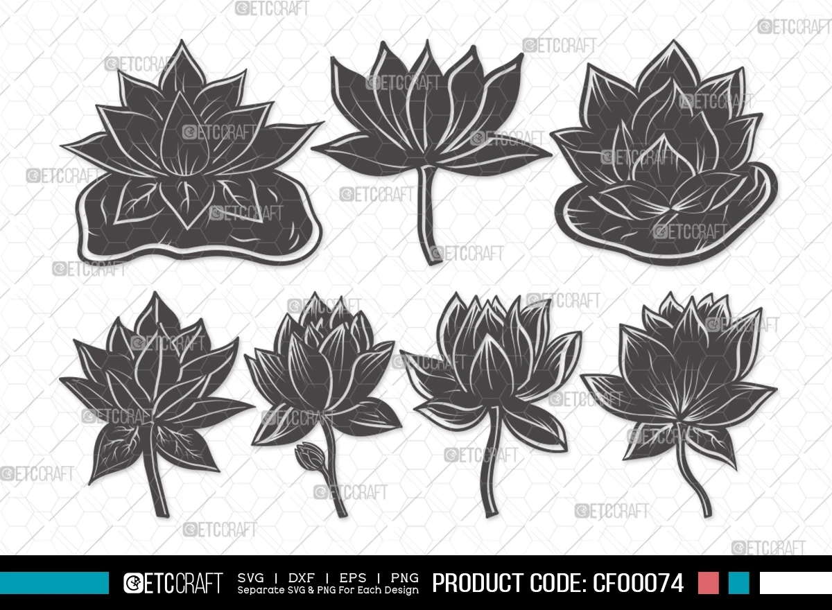 Immerse yourself in the serenity of the "Lotus Flower Silhouette Floral" SVG Cut Files Bundle and let these enchanting silhouettes inspire your creative journey.
