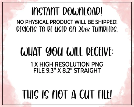 This listing is for an instant downloadable file designed to be used on 20oz skinny tumblers. No physical products will be shipped as this is an instant download. Refunds and/or cancellations are not permitted on digital downloads. Please contact me if you have any issues with the files.