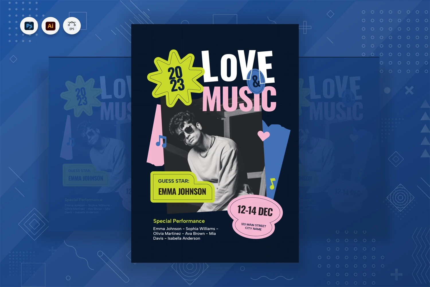 Here is our business Poster template! This is creative and corporate style Poster template, **Love Music Poster** - Get it now!,great Poster template for All business and personal needs. All elements on this template are editable from Ai & EPS tools, input your content, replace your image with a placeholder, change the color, and, all templates include professional layouts and present your template to the world. This design will great for promoting Specification