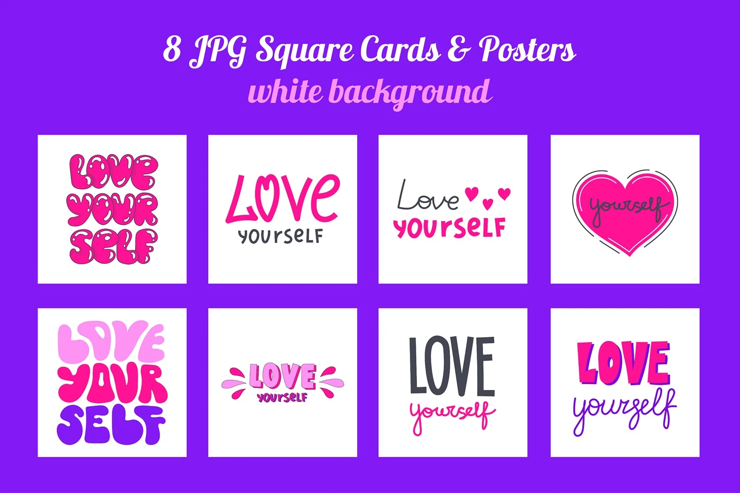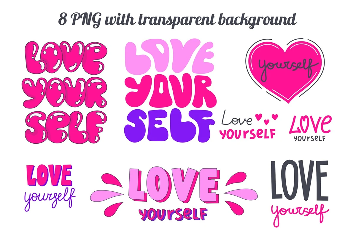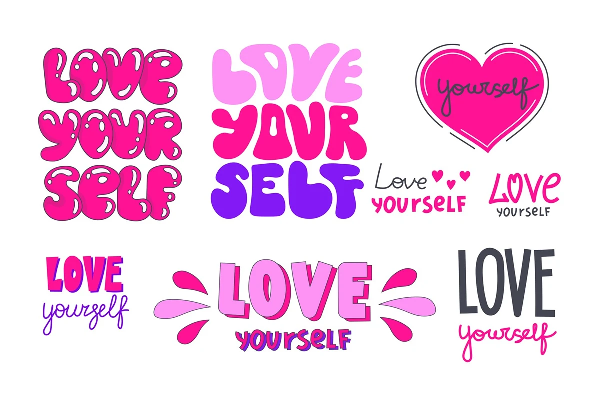 Trendy handwritten motivational slogans in various styles retro, cartoon, graffiti, calligraphy. Modern hand drawn text for t-shirt, print, girl, woman, accessory, beauty industry, psychology topics. 90s aesthetics clipart.