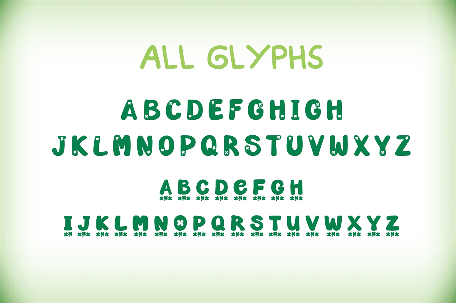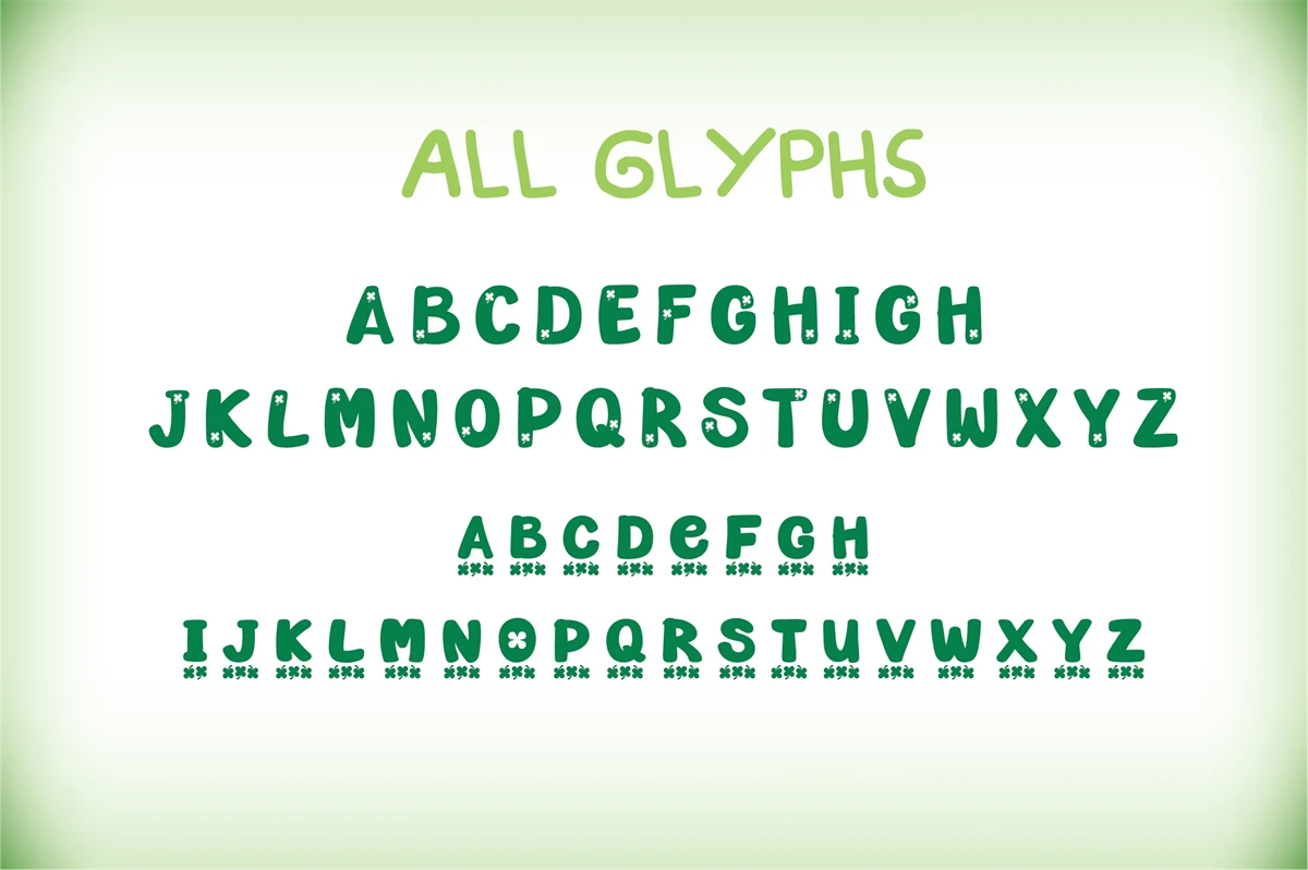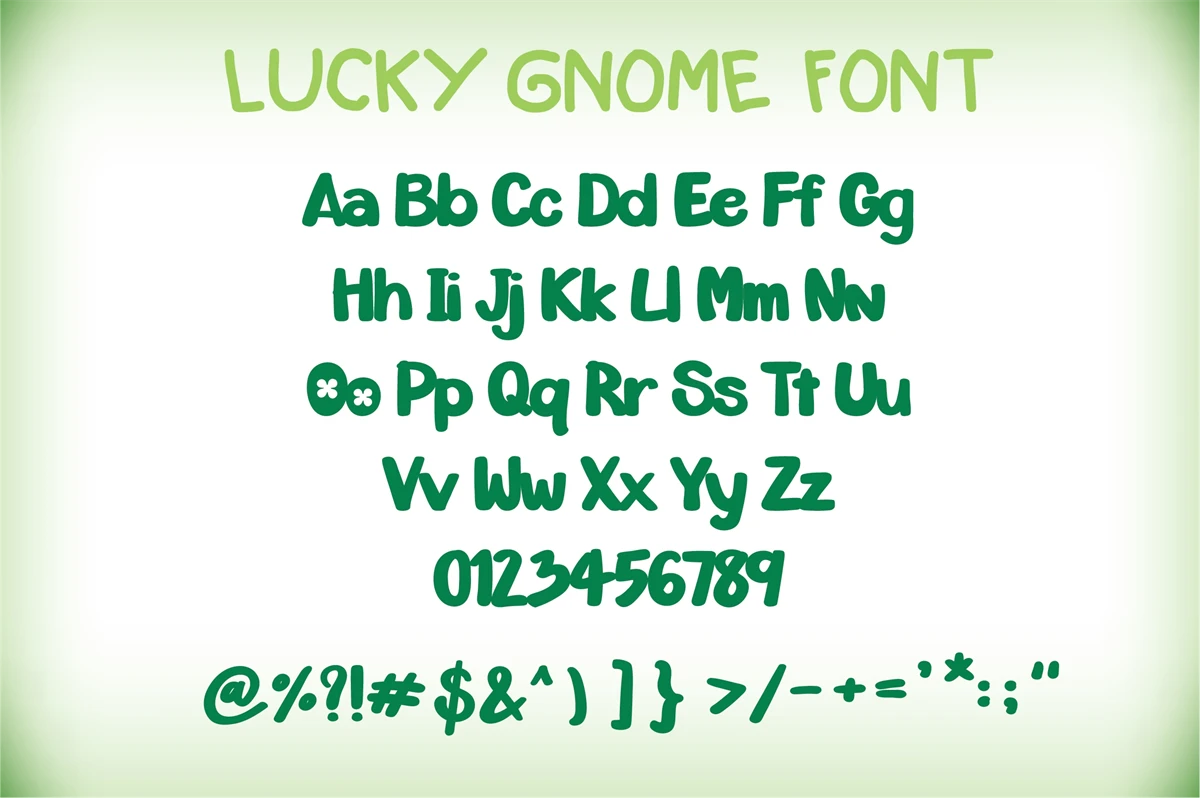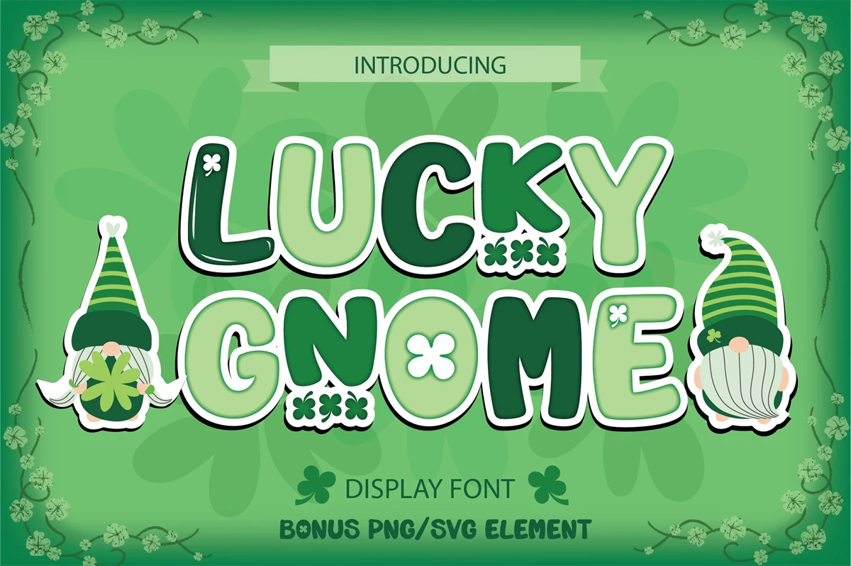 Get ready for St Patricks Day with this fun decorative display font! Lucky Gnome lowercase letters are decorated with clovers, so it will definitely bring some luck and cheer to your designs.