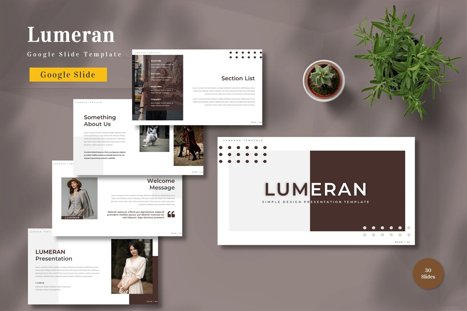 Get it now! **Lumeran - Google Slide Template** for All Business and Personal Needs All elements on this template are editable; input your content, replace your image with a placeholder, change the color, and all presentations include an animated slide to present your slides.
