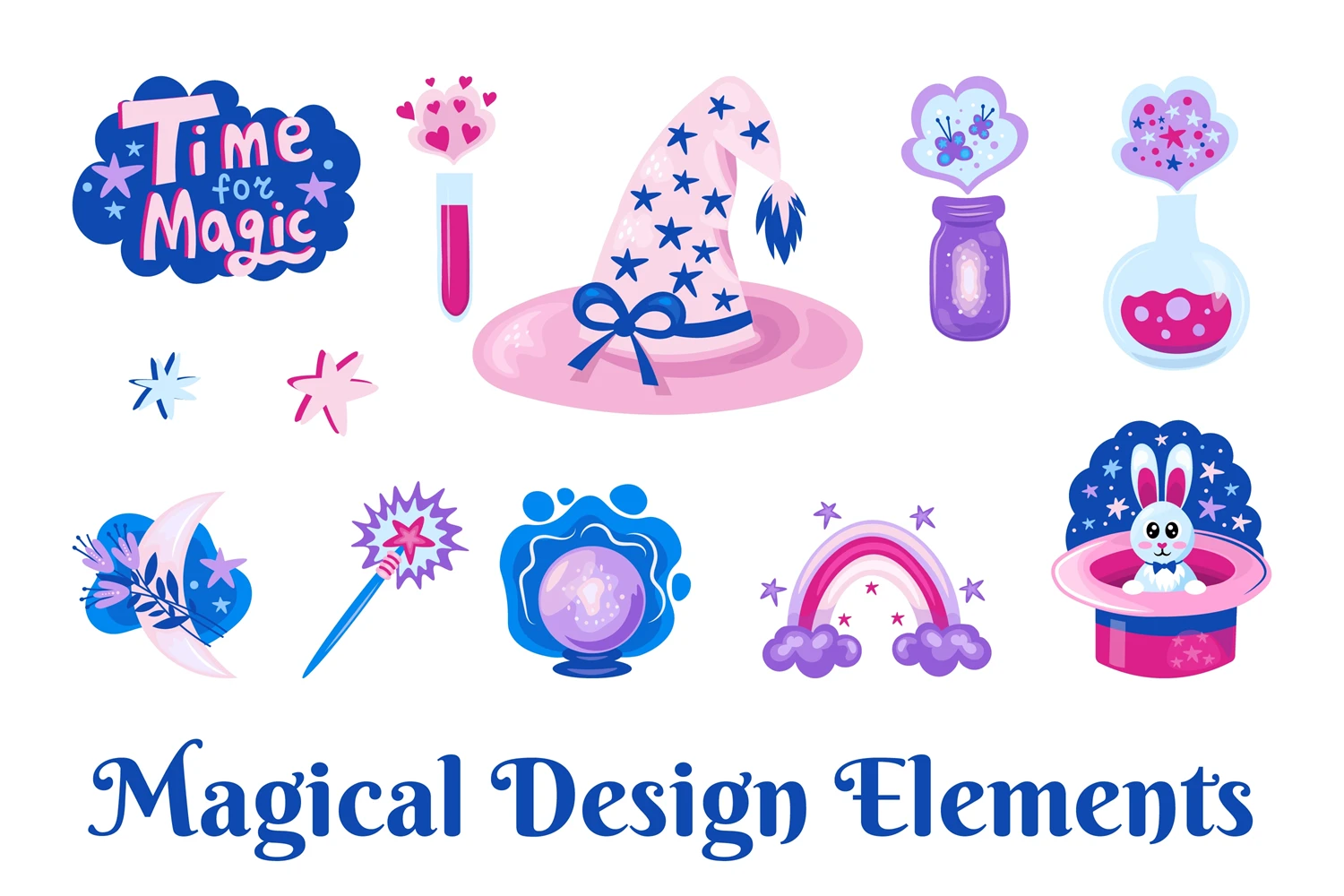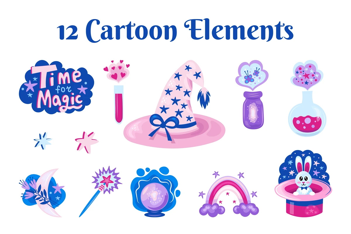 Magical shiny cartoon elements set. Mystical fairytale PNG clipart with witch hat, magical wand, rainbow, crescent, rabbit in a hat, star, crystal ball, magic elixir. Vector illustration for kids, greeting cards, invitations, stickers, sublimation.