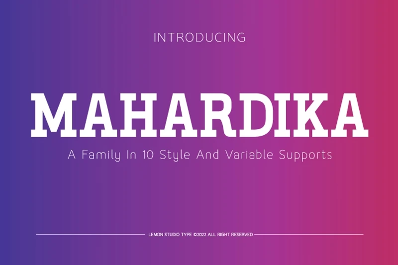 MAHARDIKA is a simple Retro SPORT sans family with variable font technology, and its axis weight range spreads from Light to black forms. Flexible and adaptable,