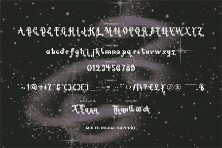 The alternative characters were divided into several Open Type features such as Stylistic Sets, Stylistic Alternates, Contextual Alternate, SWASH and Ligature. The Open Type features can be accessed by using Open Type savvy programs such as Adobe Illustrator, Adobe InDesign, Adobe Photoshop Corel Draw X version, And Microsoft Word. And this Font has given PUA unicode (specially coded fonts). so that all the alternate characters can easily be accessed in full