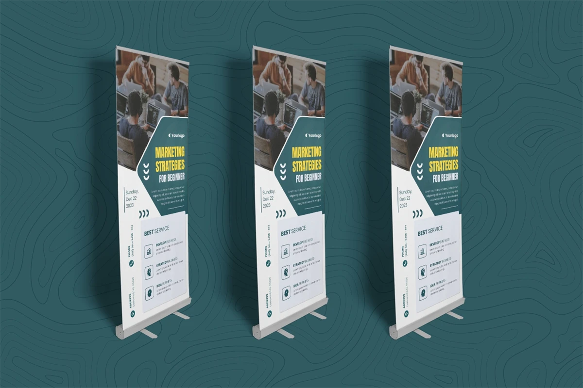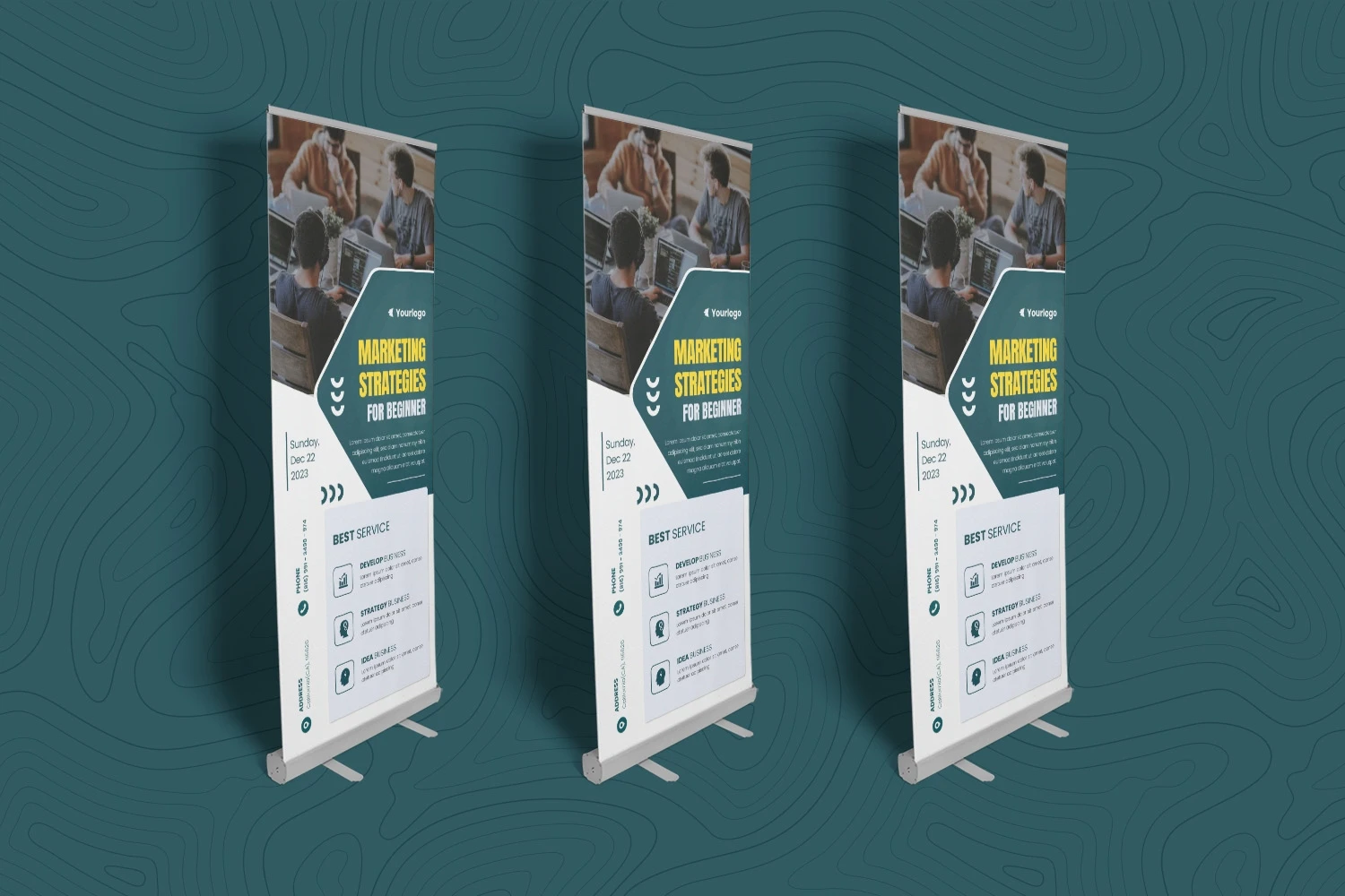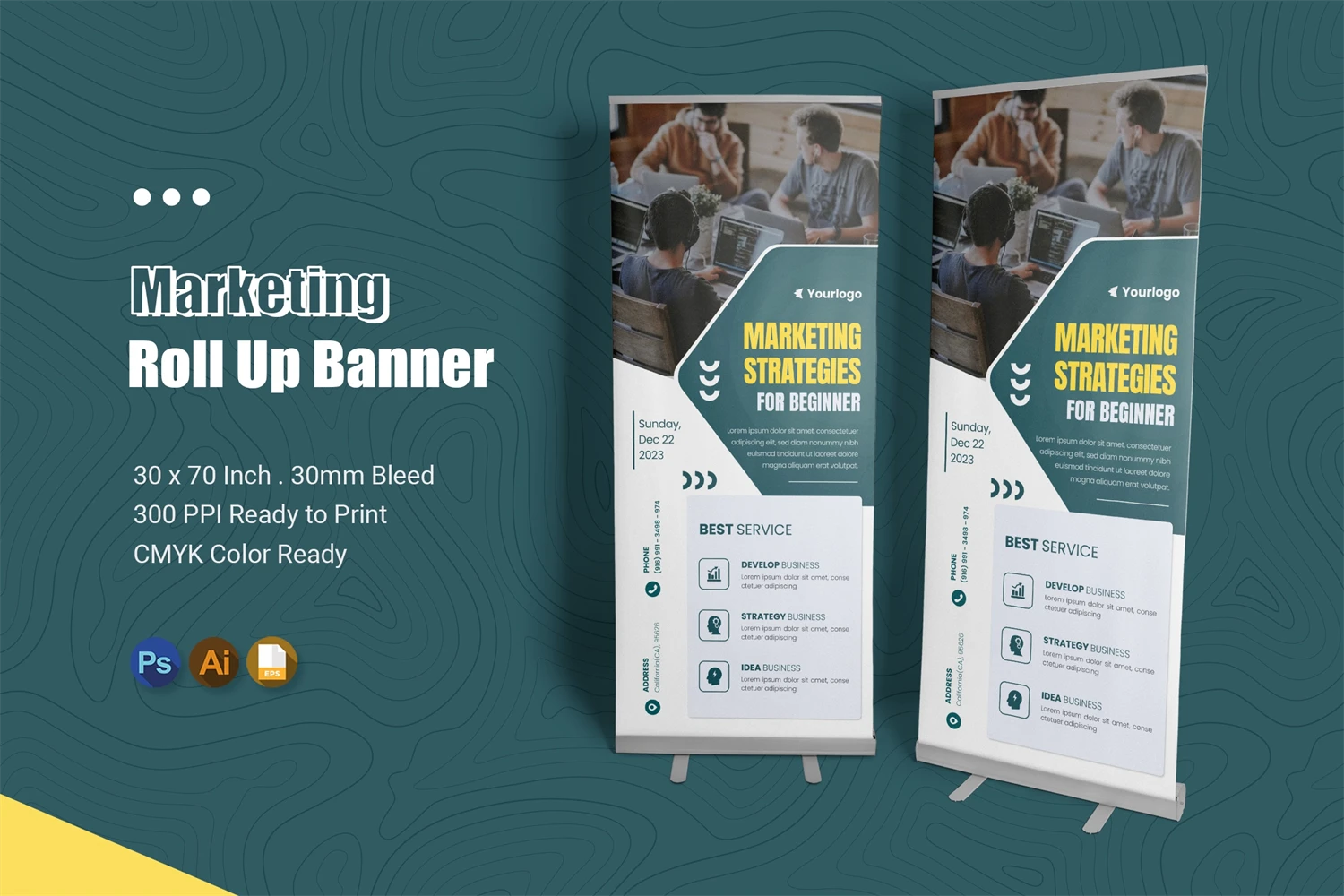 The versatile roll up banner template is very easy to use, modify and customize. Use this roll up banner and make the most of your campaign!