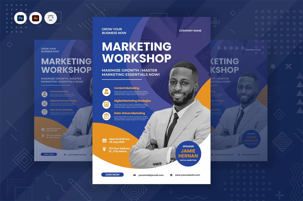 Here is our business Poster template! This is creative and corporate style Poster template, **Marketing Workshop Poster**- Get it now!,great Poster template for All business and personal needs. All elements on this template are editable from Ai & EPS tools, input your content, replace your image with a placeholder, change the color, and, all templates include professional layouts and present your template to the world. This design will great for promoting Specification