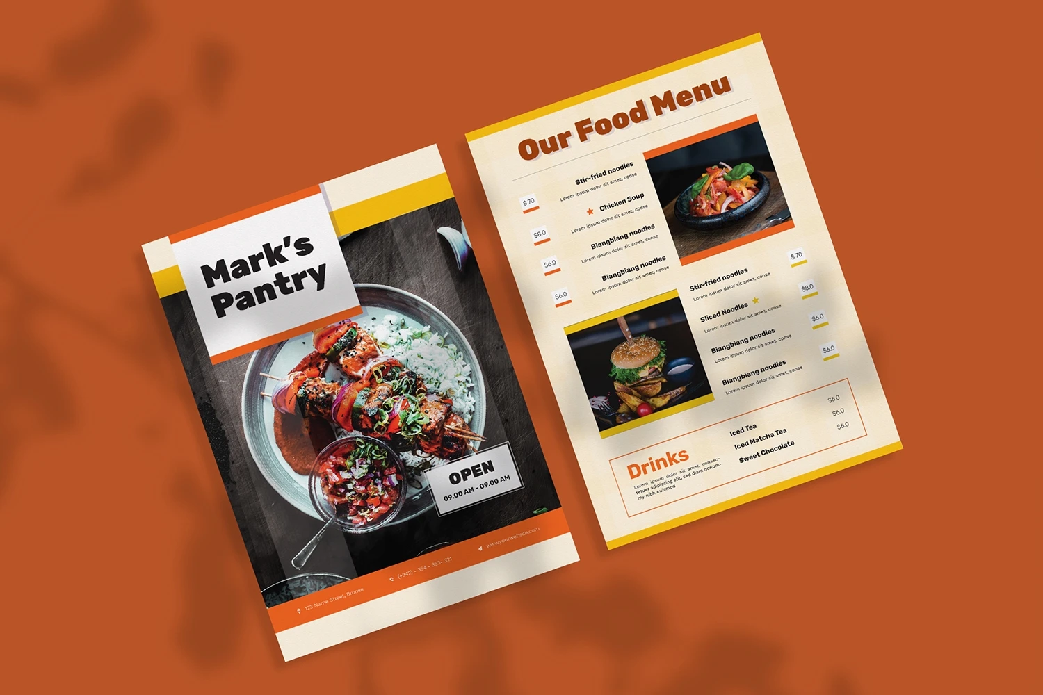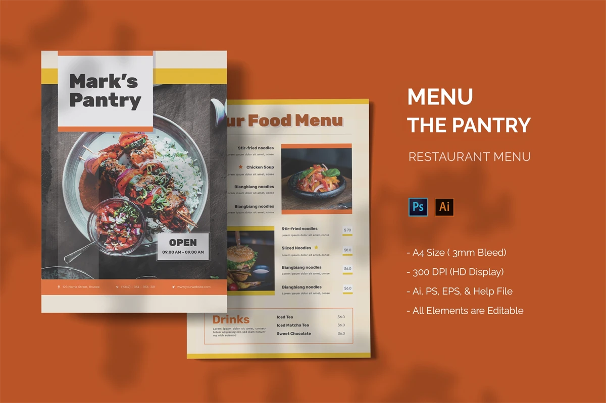 Mark's Pantry - Restaurant Menu. This template is great for your business and will make your customers interested, elegant, and easily editable according to your needs, this restaurant menu is perfect for, promos, cafes, hotels, resort shops online. etc. I hope you enjoy this restaurant menu