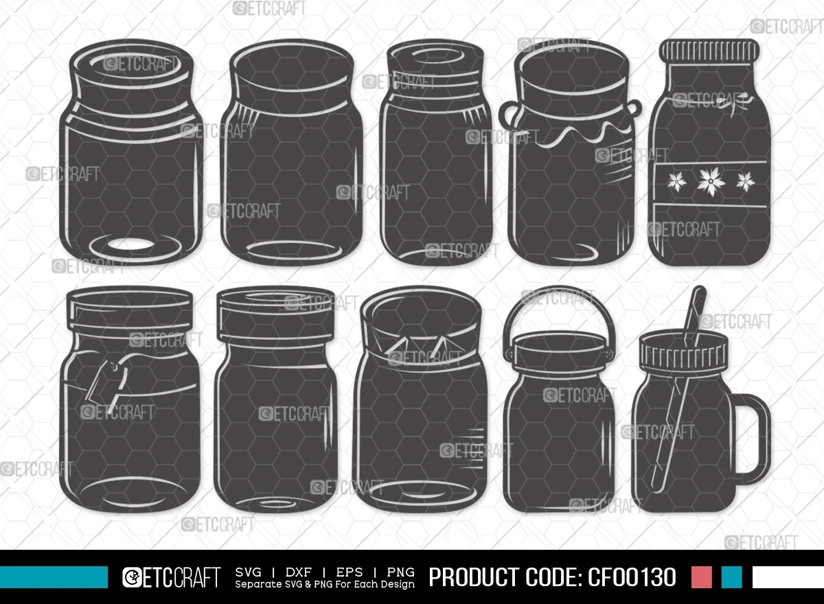 Infuse your projects with a touch of timeless elegance using our Mason Jars Silhouette Jam Bottle SVG Cut File Bundle. This collection features a captivating array of silhouette designs inspired by mason jars and jam bottles, perfect for adding a classic and chic vibe to your crafts. Whether you're a crafting enthusiast, a DIY aficionado, or a lover of vintage aesthetics, this bundle provides the ideal tools to create designs with a sophisticated and charming allure.